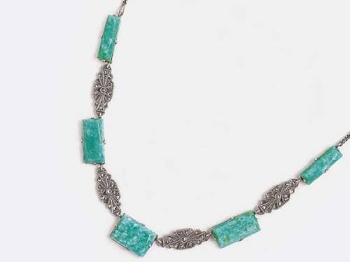 Silver, thin fancy flat links, in the middle there are 5 cut angular form claw set amazonites alternating with pierced links with marcasite decoration, circa 1930, unmarked, length: 45 cm, weight: 11.4 g, 1 stone is missing