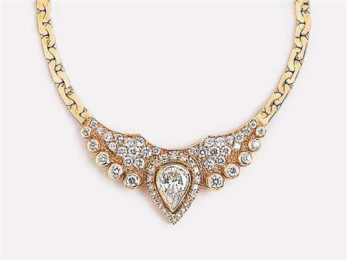 18 K gold, 1 big drop shape brilliant circa 1.0 ct (MCSi) in the middle and 36 small brilliants circa 1.0 ct (MCrVs), modern, weight: 21.7 g.
