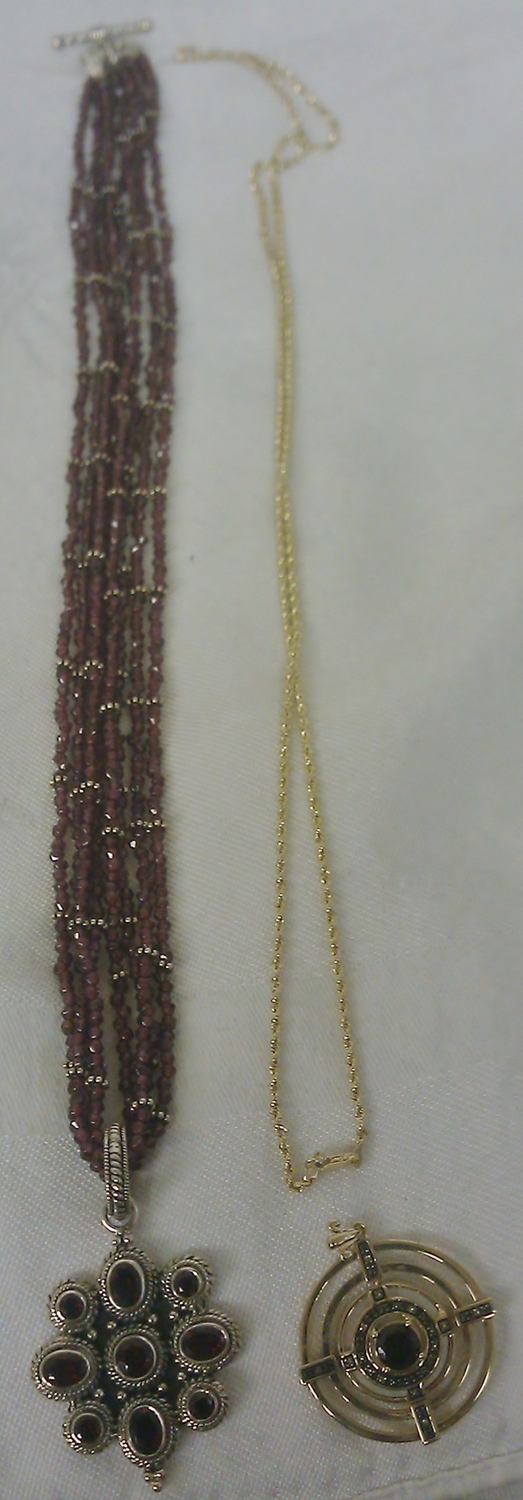 A four strand garnet bead necklace w/sterling silver rondels & clasp& A Sterling silver pendant Set w/ 9 faceted garnets