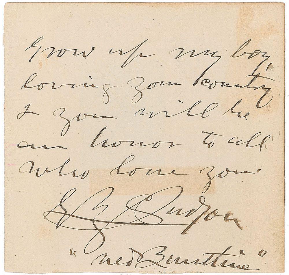 American publisher, journalist, writer and publicist (1813-1886) best known for his dime novels and the Colt Buntline Special he commissioned from Colt’s Manufacturing Company. AQS, signed “E. Z. C. Judson, ‘Ned Buntline,’” on a 5 x 4.75 off-white sheet. Buntline writes, in full: “Grow up my boy loving your country & you will be an honor to all who love you.” In very good condition, with scattered toning and a trimmed bottom edge.