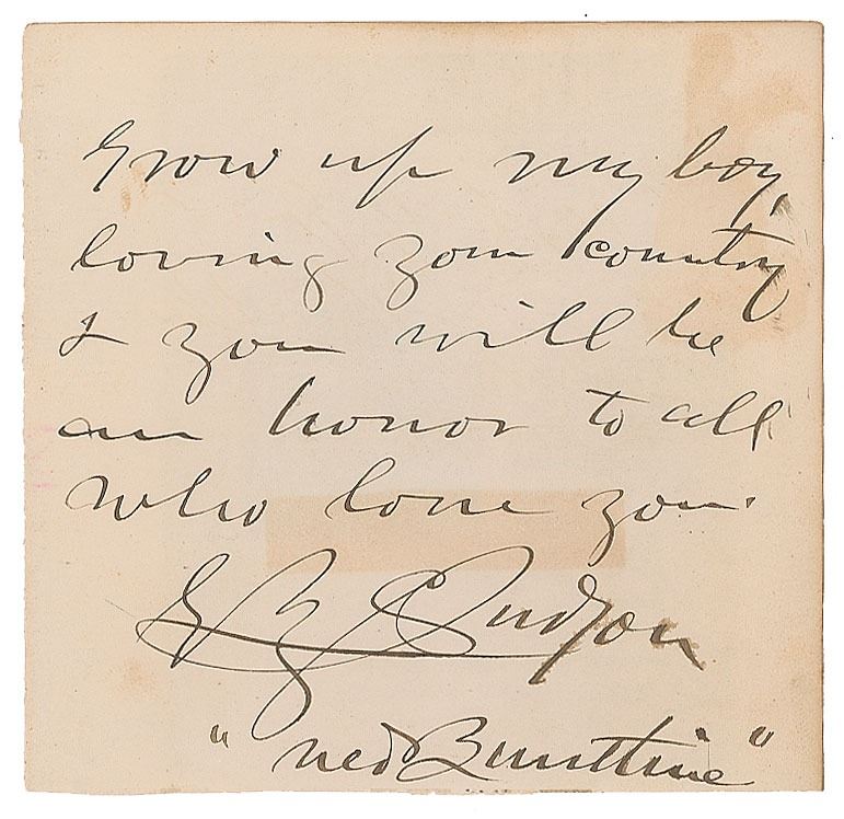 American publisher, journalist, writer and publicist (1813-1886) best known for his dime novels and the Colt Buntline Special he commissioned from Colt's Manufacturing Company. AQS on an off-white 5 x 4.75 sheet, signed "E. Z. C. Judson, 'Ned Buntline,'" In full: "Grow up my boy loving your country & you will be an honor to all who love you." In very good condition, with scattered toning and a trimmed bottom edge. In fine condition, with two small blocks of toning.