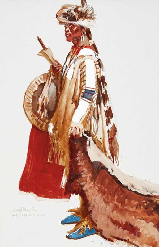 To the unaided eye, this piece appears to be in excellent condition. Inspection under ultraviolet light reveals a normal fluorescence of the artist's pigments. There are no signs of damage or restoration. The piece is mounted under glass with a linen liner and a dark antiqued gold fillet. The piece is framed in a dark antiqued gold framed. The frame is in good conditions tructurally, though there are abrasions throughout. Verso: [handwritten on backing] Corp. Acct. 20-5-1-0 #96; Title Assiniboine (Wolf-Skin Cap), Medium Gouache, Size 23 x 15, Cat. No. 413G; [stamped on backing] Reproduction Rights Reserved by the Artist. -Ned Jacob-