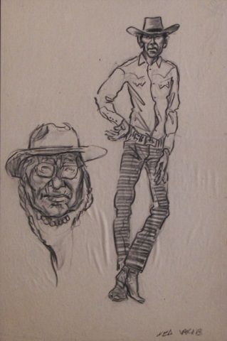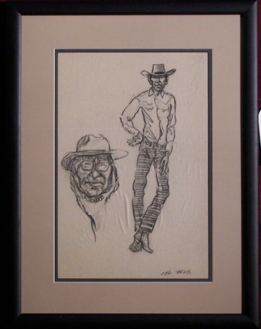 Ned Jacob, Black Crayon , (2546) Ned Jacob, Black Crayon on Charcoal, Cowboy and Indian, 10" x 14 1/2" Sight, Signed Lower Right