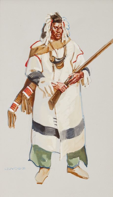 To the unaided eye, this piece appears to be in excellent condition. Inspection under ultraviolet light reveals a normal fluorescence of the artist's pigments. There are no signs of damage or restoration. The piece is mounted under glass with a linen liner and a dark antiqued gold fillet. The piece is framed in a dark antiqued gold frame. The frame is in good condition structurally though there are abrasions throughout its surface. Verso: [handwritten on backing] Corporate Acct 20-1-5-0 KM #98; Title Crow Hunter-Winter, Medium Gouache, Size 24 x 14, Cat. No. 481G; [stamp on backing] Reproduction Rights Reserved by the Artist. -Ned Jacob-; Sandra Wilson's Fine Art Gallery, Santa Fe, NM