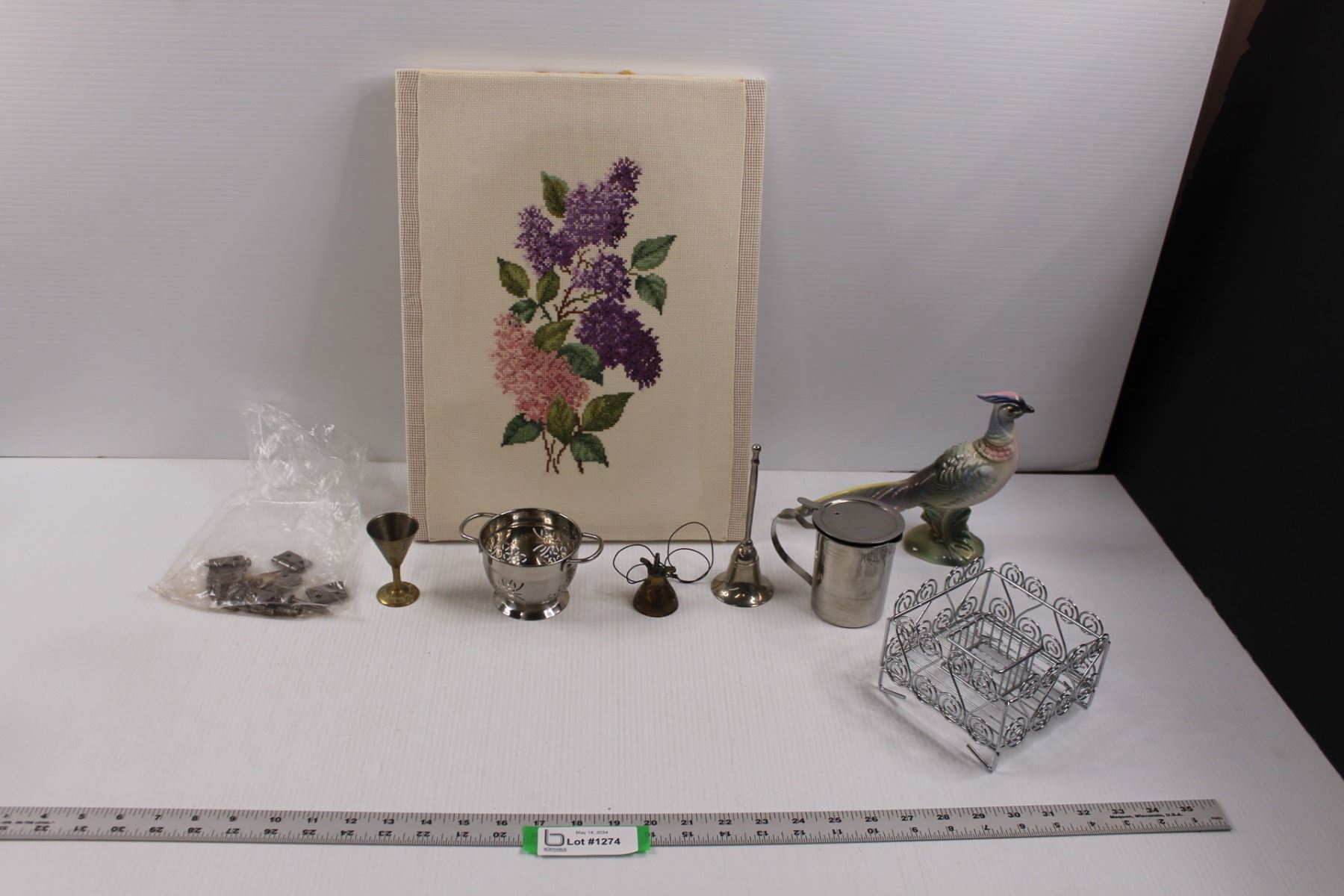 Needle Point/Cross Stitch Picture, Cream Pitcher, Brass Shot Cup, (2) Bells Small Hinges, Bird Statue etc.