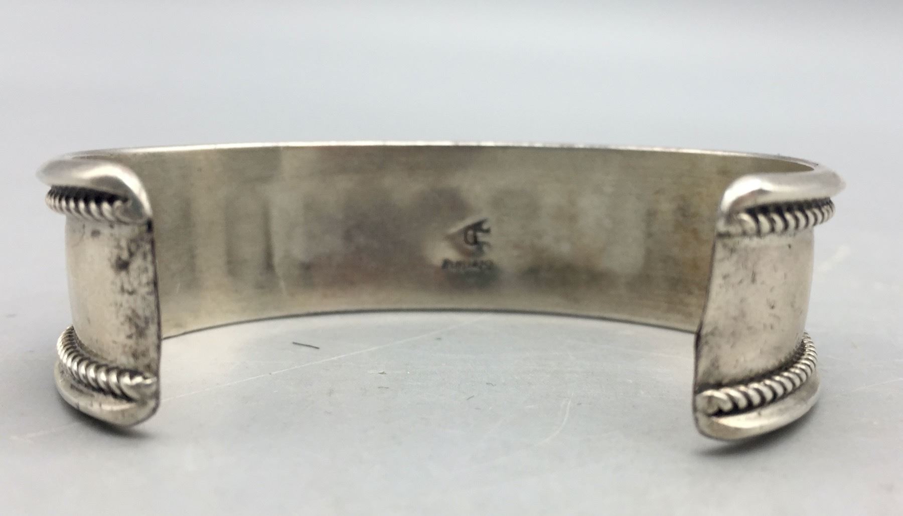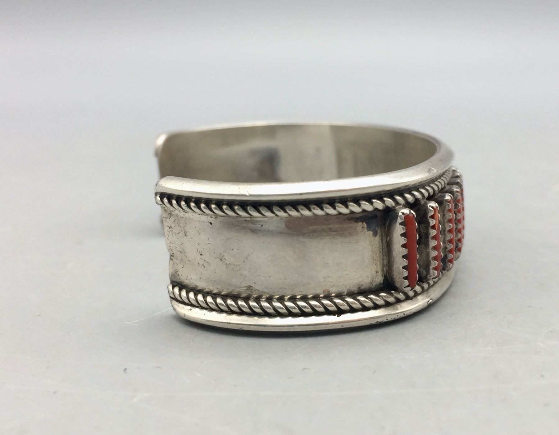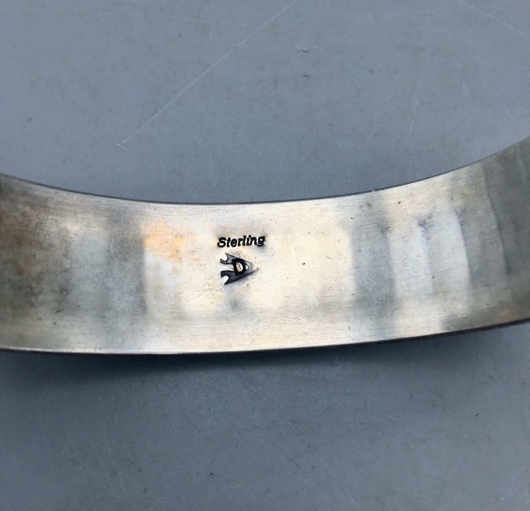 Description: For sale in this lot is a nice needle point bracelet. It is finely set with turquoise, coral and jet and is marked as sterling silver. Maker: Hallmarked with what looks like an arrow with a D. Approx. Age: Vintage. Size: Inside circumference measures 4-7/8” long. Opening is additional 1-3/8”, fitting a 6-1/4”. Width is 3/4”. Weighs 25.2 grams. Condition: Good for its age, normal wear expected. Please look closely at the pictures - they are an important part of our description. Shipping: There will be a $5 handling / packaging fee for shipping this lot. The actual cost of postage will be added on top of that.