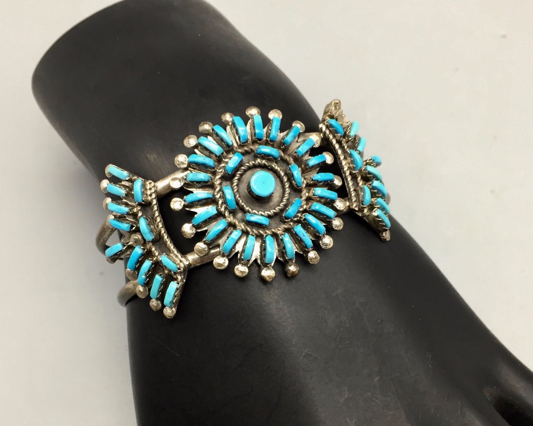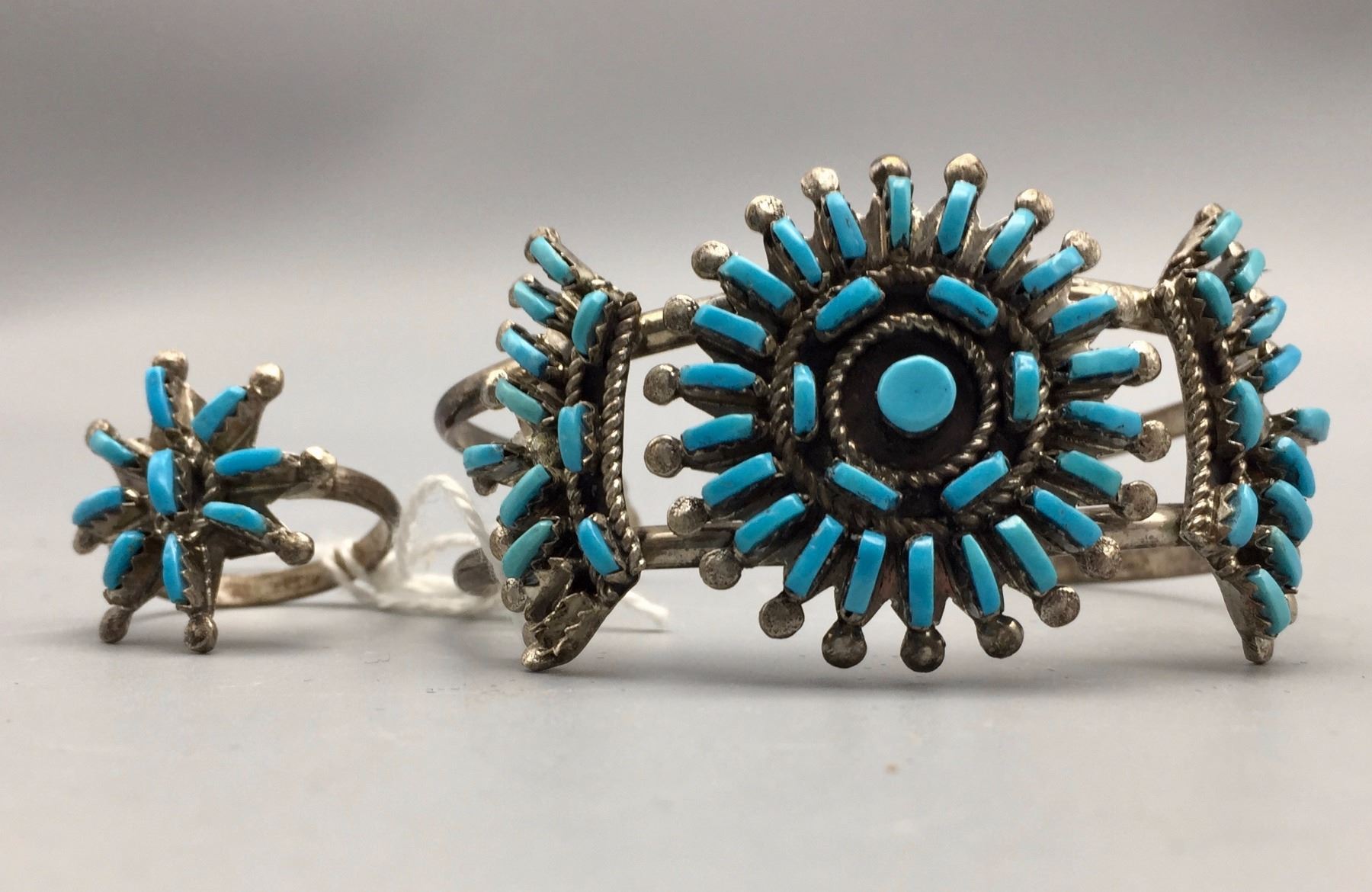 Maker: Signed, Leekity, Zuni. Approx. Age: Vintage. Size: Inside circumference 5” with an additional 1” opening (fits a 6” wrist). Almost 1 1/4” at it’s widest. Ring is size 7.5. Lot weighs 20.7 g. Additional Info: Zuni Needlepoint turquoise and sterling silver bracelet and ring set. Condition: Good for their age, normal wear expected. New, old stock (NOS). Please look closely at the pictures - they are an important part of our description. Shipping: There will be a $5 handling / packaging fee for shipping this lot. The actual cost of postage will be added on top of that.