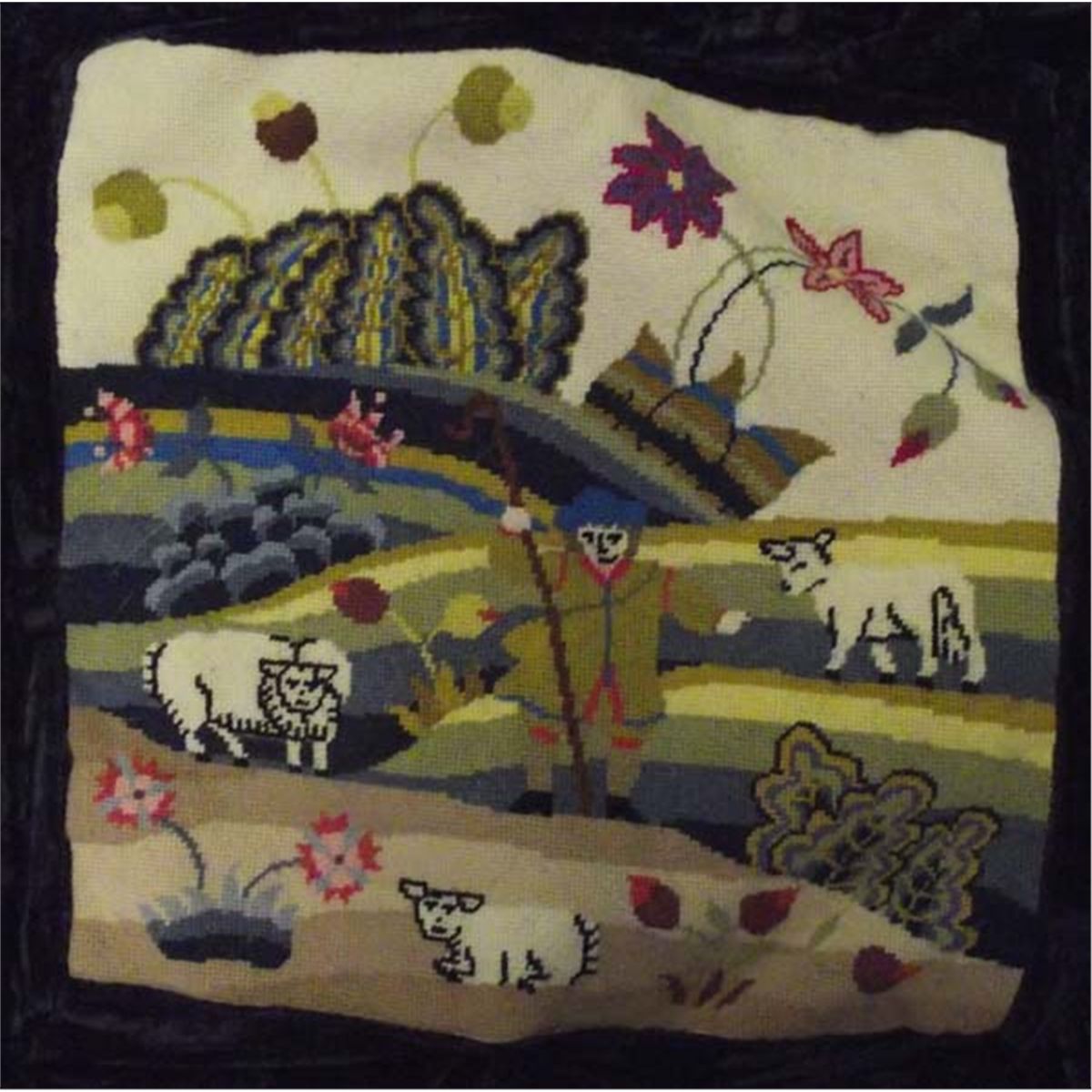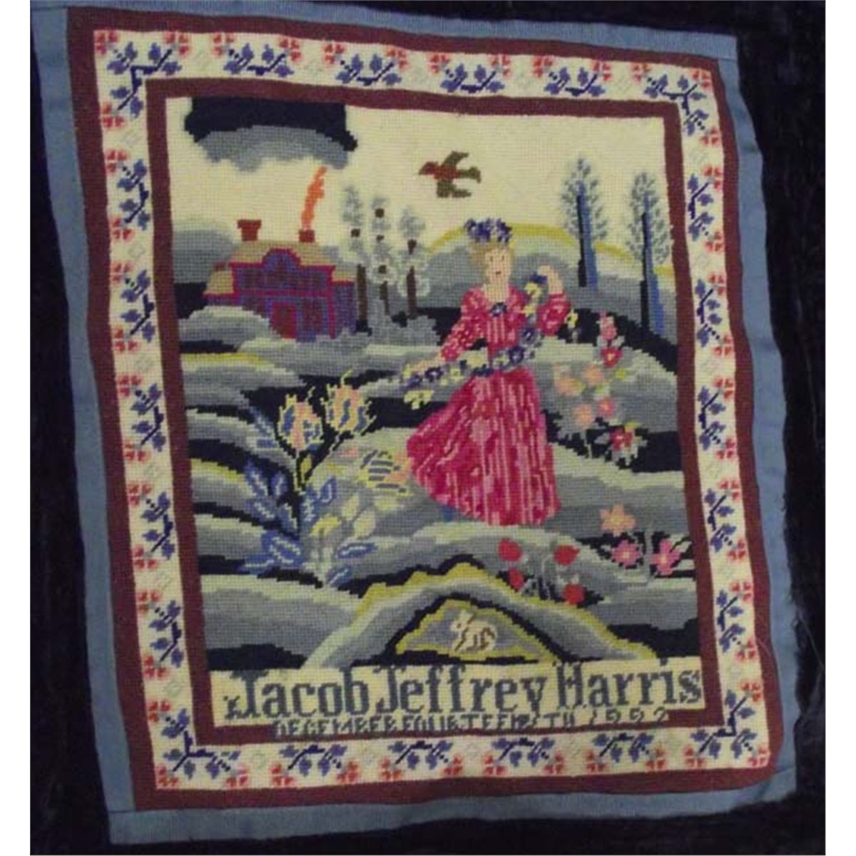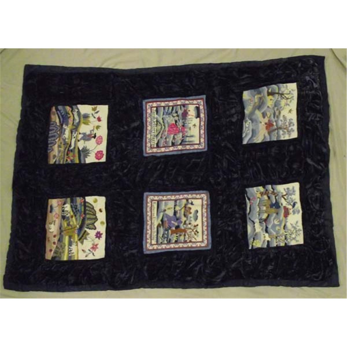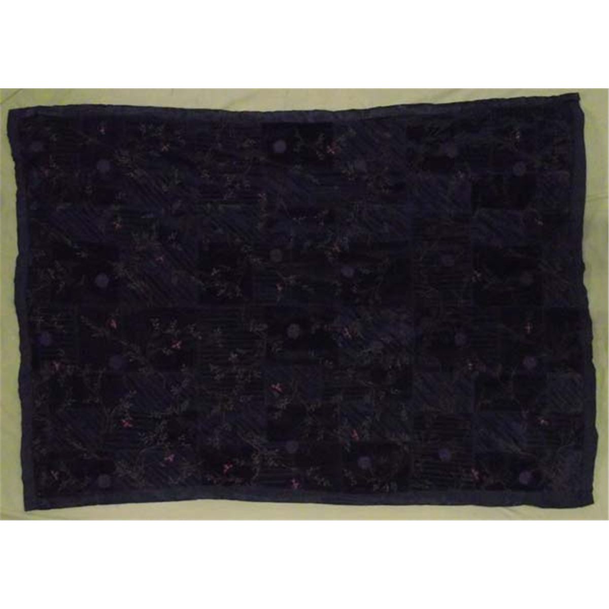 Needlepoint & Crushed Velvet Quilt. Six 10'' x 10'' needlepoint panels. The needlepoint work is framed in gathered dark blue crushed velvet. Reverse side is machine embroidered crazy quilt with floral patterns which is hand-tied. Buyers Pay Actual Shipping and Handling Charges(see terms and conditions for more information).