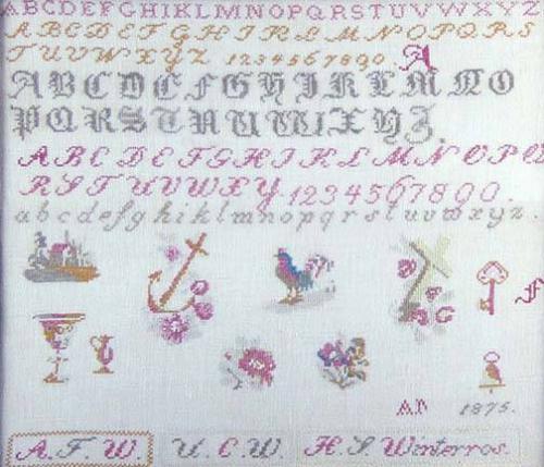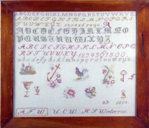 Needlepoint Sampler, 1875 by H.T. Winterros, Framed under glass, 18" x 19" (image size)