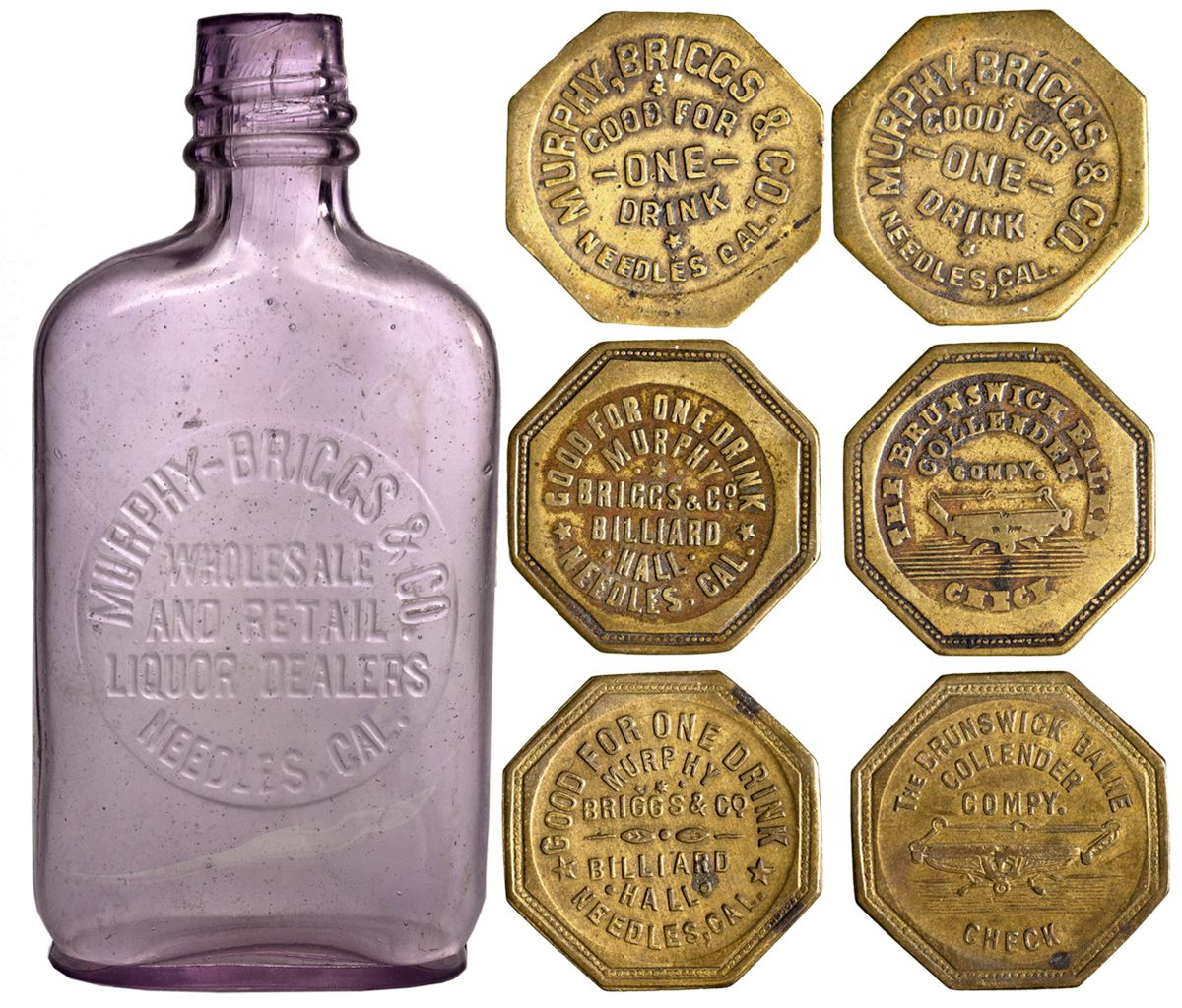 Slug reads MURPHY-BRIGGS & CO. WHOLESALE AND RETAIL LIQUOR DEALERS NEEDLES, CAL. on this sun washed violet half pint shoo fly. Footed base, air vents on each shoulder and a ground screw top, with a minute chip on spout. Also included are three octagonal "Good for One Drink" tokens. All items are in very good condition. Not listed in either Thomas or Wilson. Pairings of matching flasks and tokens are rare, and a great opportunity to round out your collections of flasks and tokens! - Feisel Collection -59230