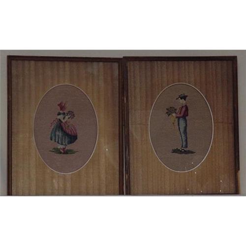 A framed pair of needlework pictures, 15 1/2" X 12 1/2", wood matts cut in ovals reveal needlepoint backgrounds with a figure of a man and woman in petite point. Figures 6 1/2" tall. Condition: Needlework in very good condtion, both frames in rough shape one with breaks in moulding.