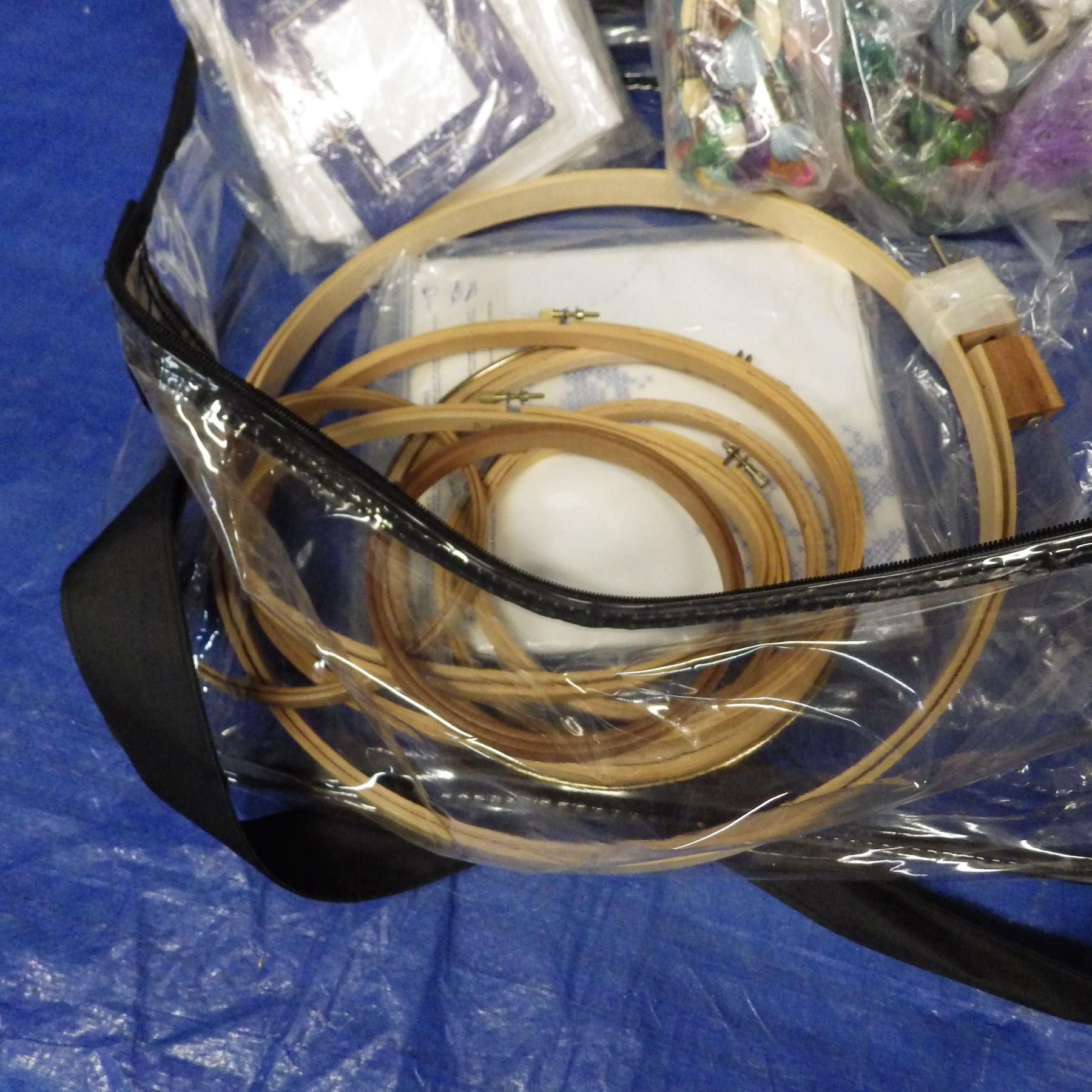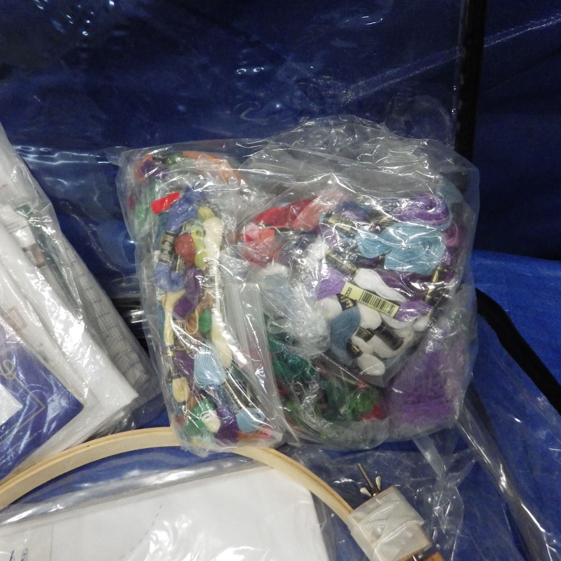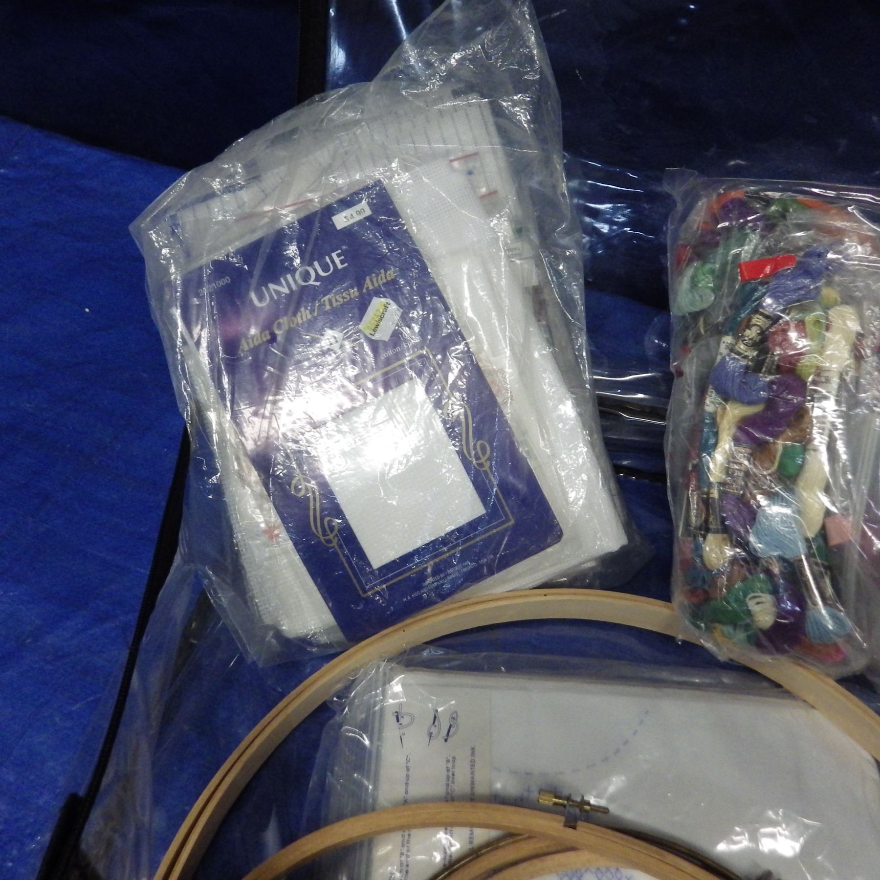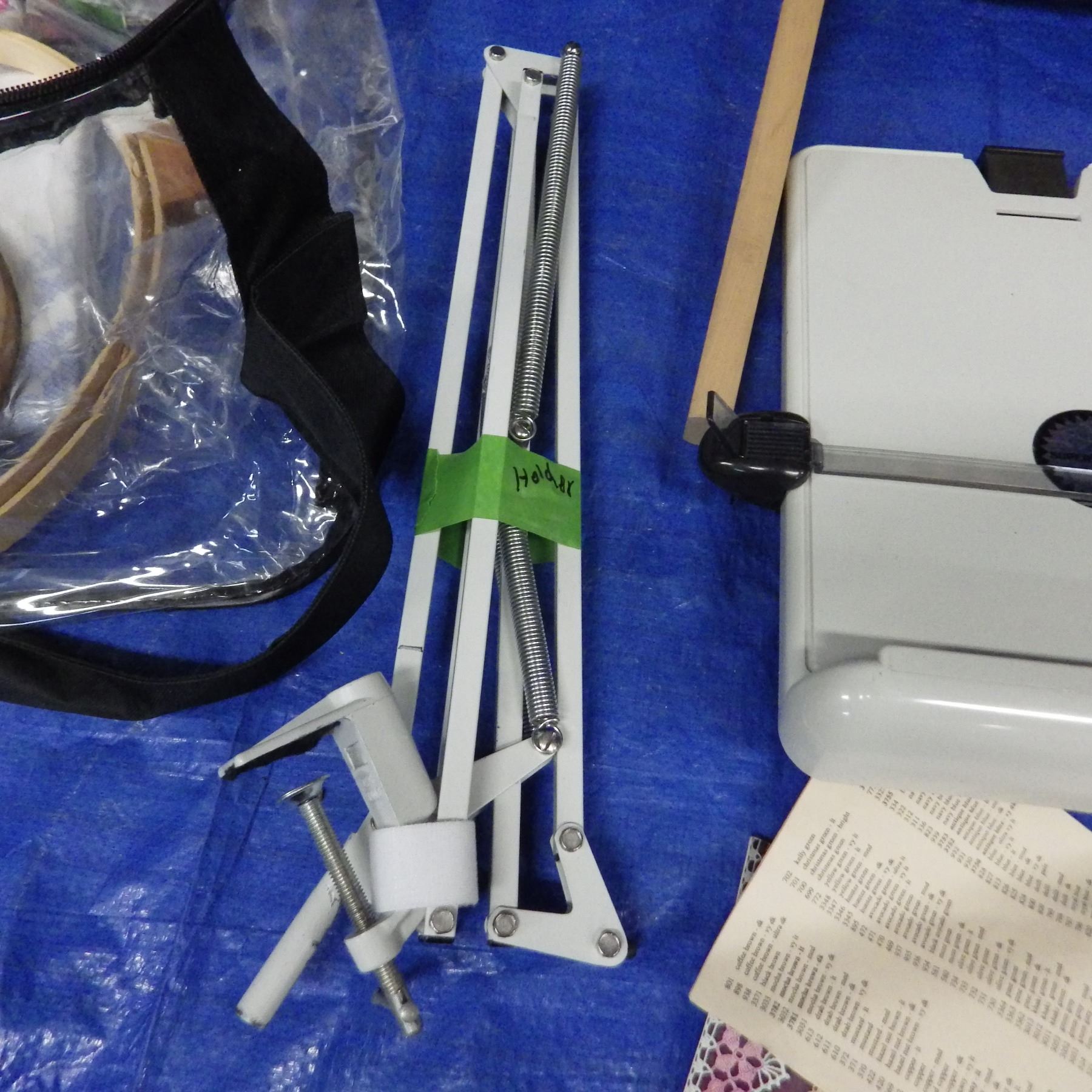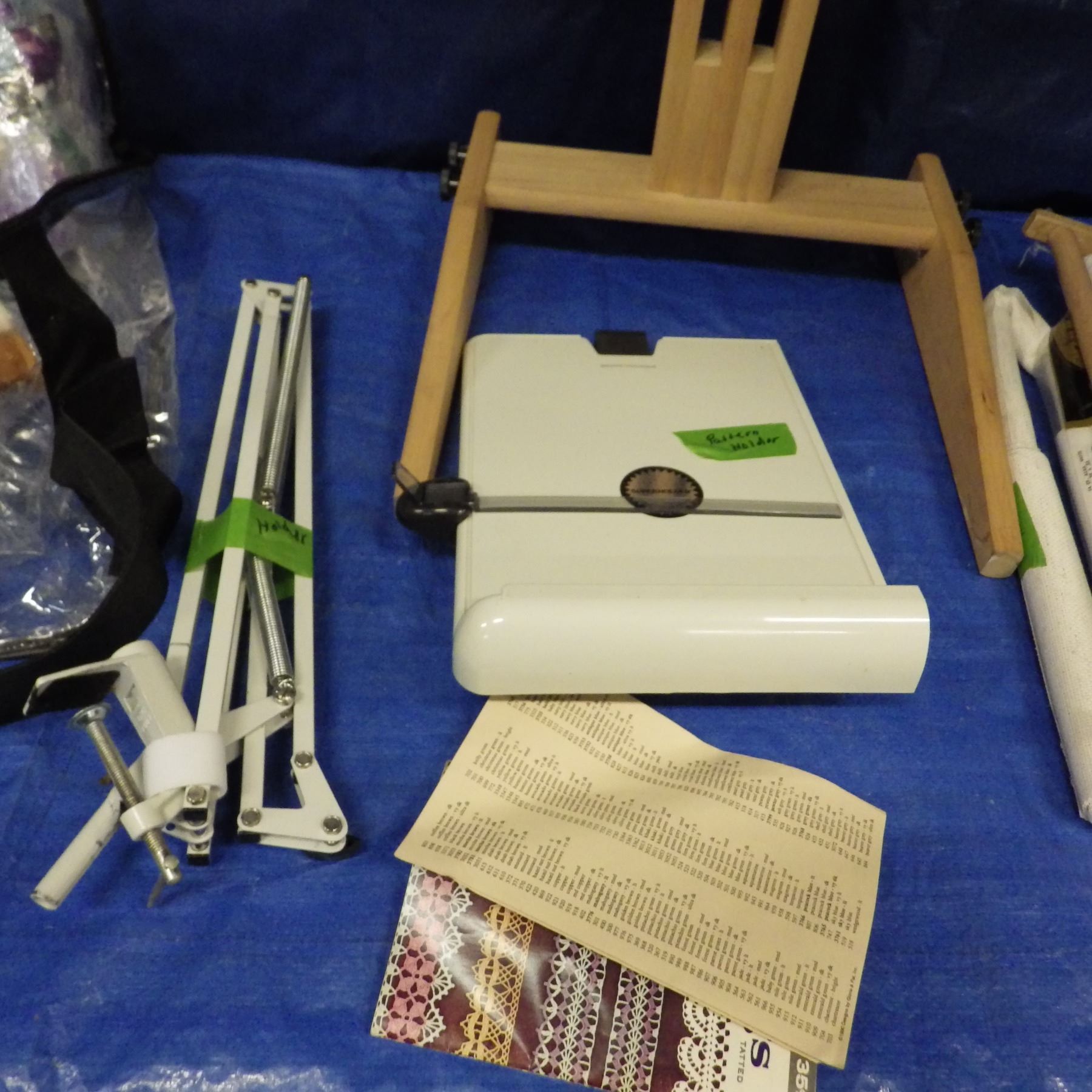Needlework and embroidery stand including embroidery hoops, threads, cloth, needles, pattern holder