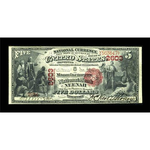 <B>Neenah, WI</B></I> - $5 1875 Fr. 405 <B>The Manufacturers NB</B></I> Ch. # 2603<BR> First Charters only from this scarce Neenah bank, which liquidated at the expiration of its charter in 1901. This is a brightly colored example with the folds visible mainly on the reverse. <B>Very Fine.</B></I><BR><BR><b>Shipping:</b> Coins & Currency (<a target="_blank" href="http://www.heritageauctions.com/common/shipping.php">view shipping information</a>)
