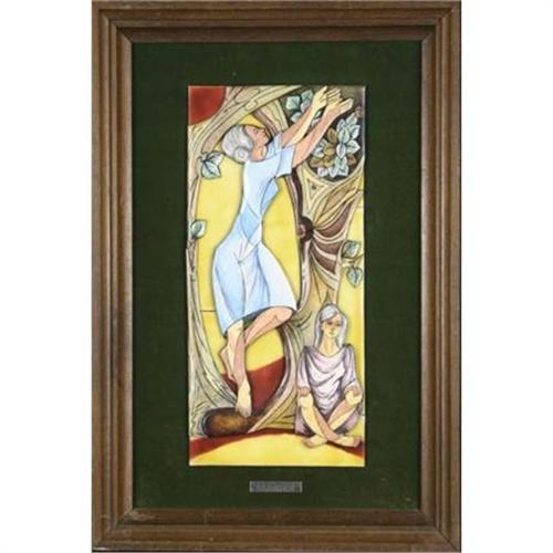 Enamel painting of two women at a tree. One is reaching up into the tree while one sits solemnly on the ground. Wonderful earth tones. The frame is an antique dark oak frame with a green velvet liner.The frame is a beautiful unique design that brings depth to the picture. The total size is 17" X 25" X 2" W