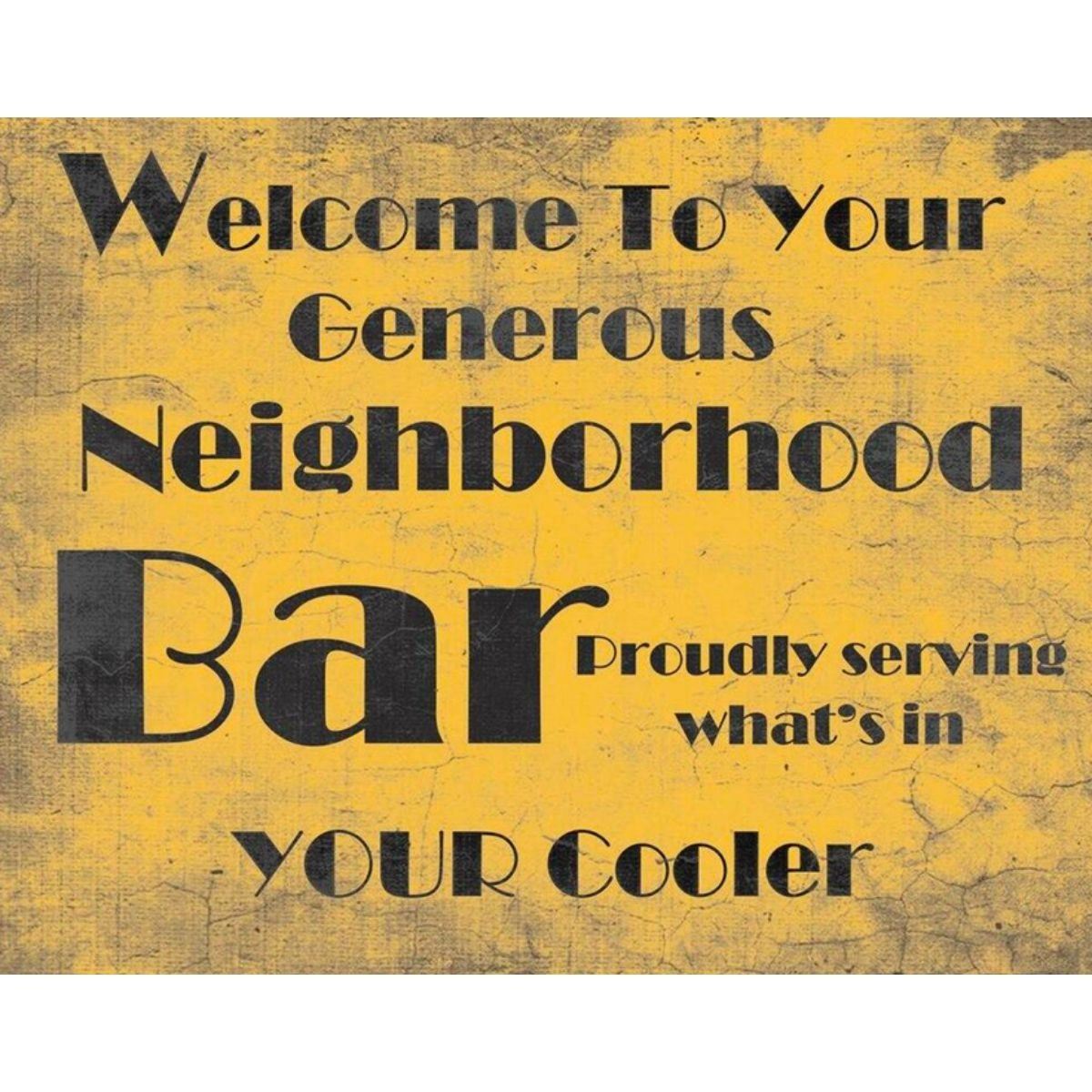Welcome To Your Generous Neighborhood Bar metal pub bar sign. 12 1/2" X 16" with pre-drilled holes for mounting.Â