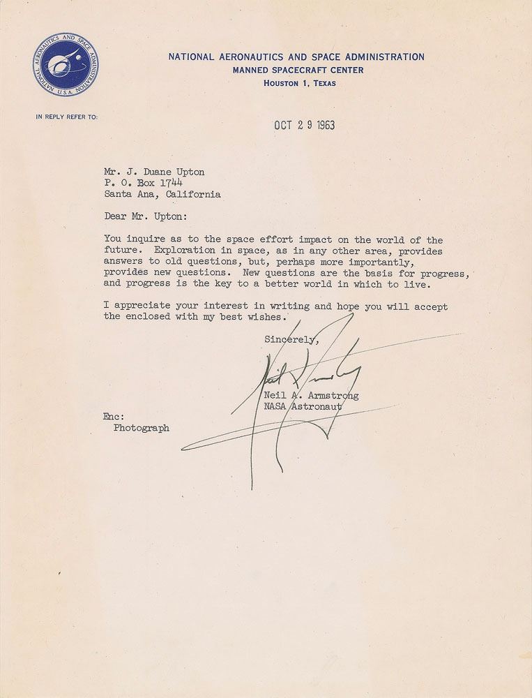 TLS, one page, 8 x 10.5, NASA letterhead, October 29, 1963. Letter to J. Duane Upton, in part: "You inquire as to the space effort impact on the world of the future. Exploration in space, as in any other area, provides answers to old questions, but, perhaps more importantly, provides new questions. New questions are the basis for progress, and progress is the key to a better world in which to live." In fine condition. At this early stage in the space program, Armstrong had no idea that he was to become the first man on the moon. He had been selected as an astronaut only a year earlier, and underwent years of rigorous training prior to his first spaceflight, Gemini 8, in 1966. This exceptional letter offers an ideal example of the early, slanted version of Armstrong's signature, and its fabulous content further elevates its desirability.