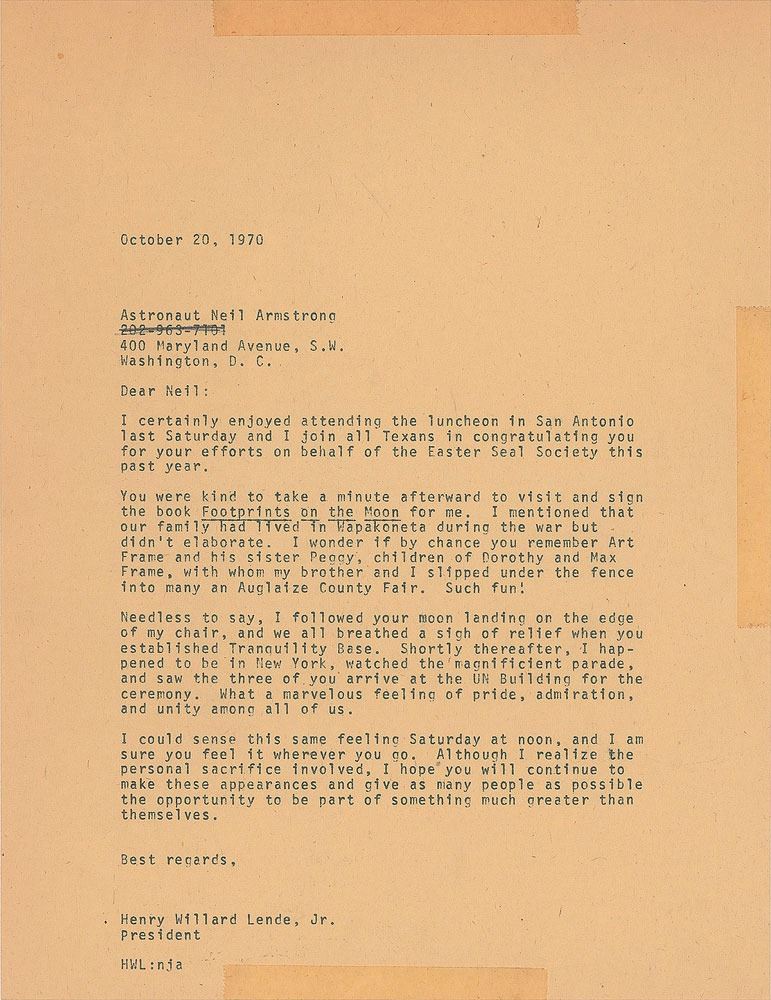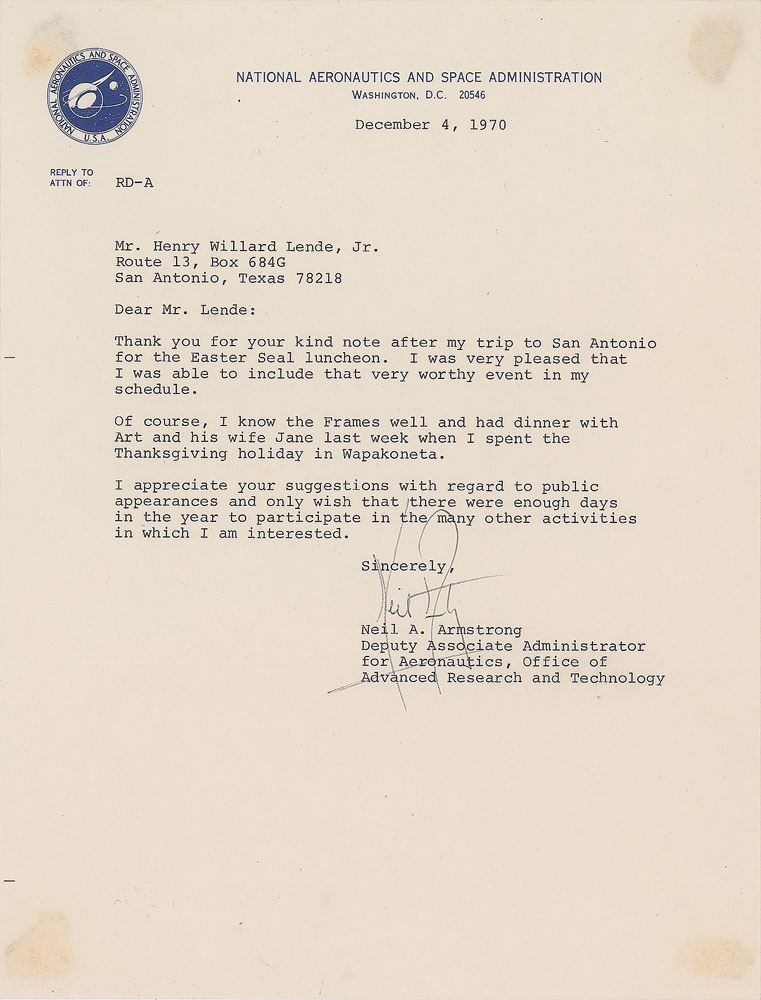 TLS, one page, 8 x 10.5, NASA letterhead, December 4, 1970. Letter to Bill Lende, "Henry Willard Lende, Jr.," in part: "Thank you for your kind note after my trip to San Antonio for the Easter Seal luncheon. I was very pleased that I was able to include that very worthy event in my schedule. Of course, I know the Frames well and had dinner with Art and his wife Jane last week when I spent the Thanksgiving holiday in Wapakoneta. I appreciate your suggestions with regard to public appearances and only wish that there were enough days in the year to participate in the many other activities in which I am interested." In fine condition, with show-through from adhesive remnants to each corner. Accompanied by Lende's retained carbon copy of his letter to Armstrong, October 20, 1970, in which he mentions that he lived briefly in Armstrong's hometown, Wapakoneta, where he was a friend of the Frame family.