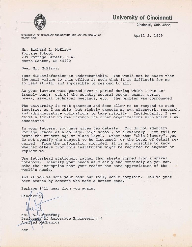 TLS, one page, 8.5 x 11, University of Cincinnati letterhead, April 2, 1979. Letter to Richard L. McElroy at the Portage School in North Canton, Ohio, apparently in response to a request for a classroom lecture. In part: "You would not be aware that the mail volume to this office is such that it is difficult for me to read it all, and impossible to respond to it all…In your letters you have given few details. You do not identify Portage School as a college, high school, or elementary. You fail to state the student age or class level. Other than 'Ohio history,' you do not specify the subject to be discussed, or the level of detail required. From the information provided, it is not possible to know whether others from this institution might be required to augment or replace me. Use letterhead stationery rather than sheets ripped from a spiral notebook. Identify your needs as clearly and concisely as you can. Make the assumption that your reader has some appreciation of the world's needs. And if you've done your best but fail, don't complain. You've just been beaten by someone who made a better case. Perhaps I'll hear from you again." In fine condition, with scattered creasing and a couple spots of toning. With a 'one small step' in 1969, Neil Armstrong became an instant global icon. However, he shied away from the spotlight and did not bask in his glory. This letter reveals Armstrong as a reluctant hero—inundated with fan mail from around the world, he could become ornery if he felt he was being taken advantage of (thus his decision to stop signing autographs around 1994). Nevertheless, Armstrong truly enjoyed teaching and worked as a professor of aerospace engineering at the University of Cincinnati from 1971 to 1979. A fabulous letter from a decade after Armstrong walked on the lunar surface.