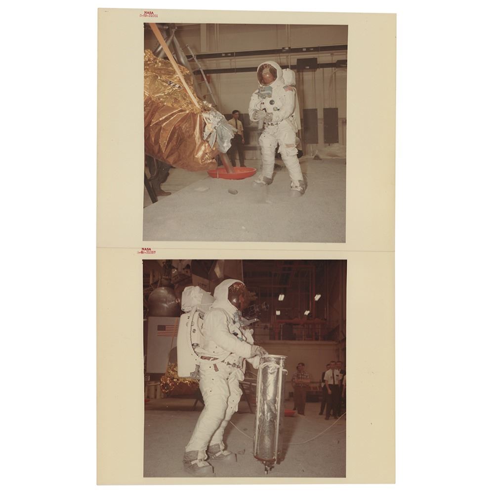 Two original vintage color glossy 10 x 8 red-numbered NASA photos (S-69-31051 and S-69-31057) of Commander Neil Armstrong during Apollo 11 training exercises: one shows Armstrong, his face visible through his helmet, looking skyward and balancing a large sample container, and the other depicts Armstrong picking up a rock near the leg of the lunar module. Reverse of both photos bear "A Kodak Paper" watermarks. In overall very fine condition.