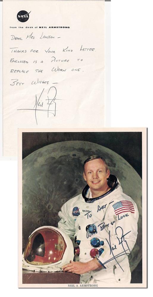 Nice autograph letter signed by Neil Armstrong, accompanied by a signed photo of the astronaut in his space suit. Letter on Armstrong's personalized NASA stationery reads in full, ''Dear Mrs. Lawson - Thanks for your kind letter. Enclosed is a picture to replace the worn one. Best Wishes - Neil Armstrong.'' 5.25'' x 8'' letter in near fine condition. 8'' x 10'' signed color photo is inscribed to Mrs. Lawson's son, ''To Art - With Best of Luck / Neil Armstrong.'' Apparently, young Art was so taken with the astronaut that he constantly carried and slept with a photo of Armstrong. Art's mother contacted Armstrong, who was so taken with the young boy that he mailed him a signed photo along with the letter.