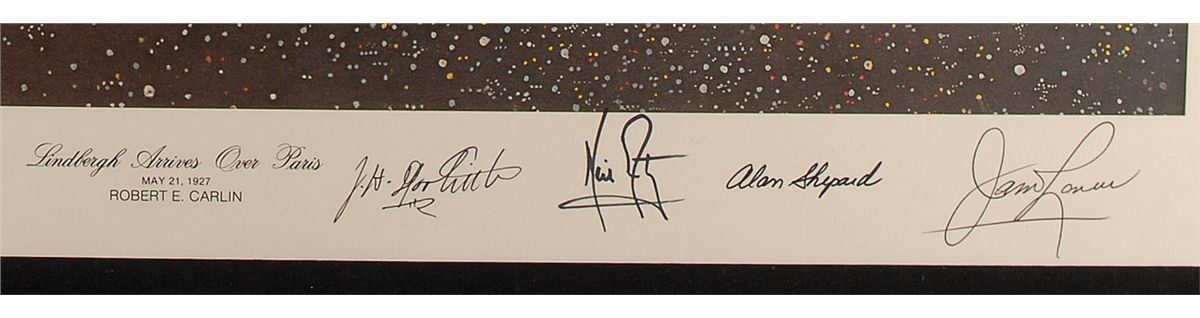 Nostalgic color limited edition 28 x 20 print entitled ‘Lindbergh Arrives Over Paris,’ May 21, 1927, numbered #54/100, signed in the bottom border in black felt tip by Neil Armstrong, Alan Shepard, James Lovell, and J. H. Doolittle. Also signed in black felt tip by the artist, Robert E. Carlin. Rolled and in fine condition, with a light bend to the bottom right corner.