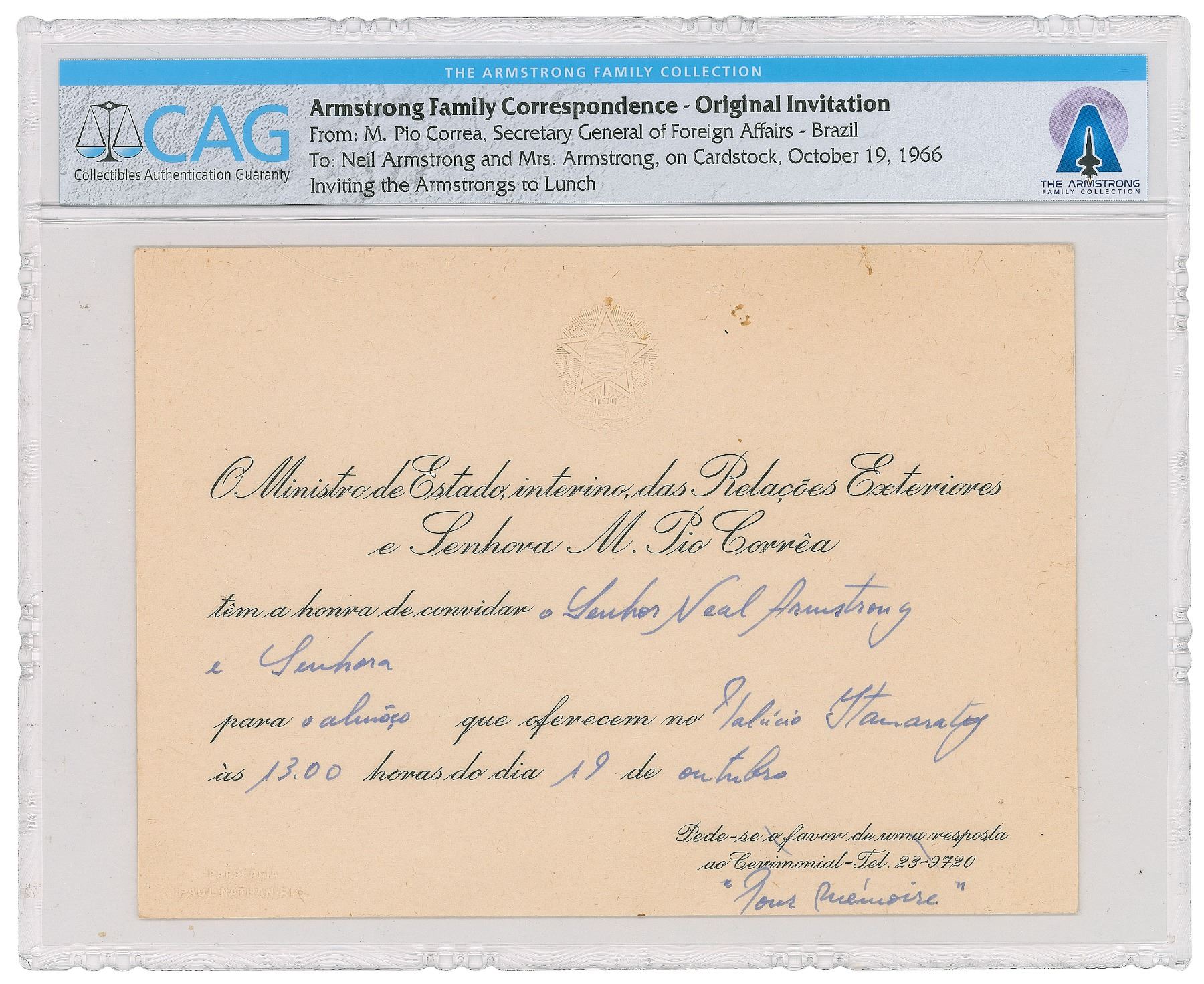 Neil Armstrong's partially printed Portuguese-language invitation from Manoel Pio Corrêa, the Secretary General of Foreign Affairs of Brazil, one page, 6.5 x 4.5, requesting the attendance of Gemini 8 Command Pilot Armstrong and his wife at a luncheon on October 19, 1966. In fine condition, with a few tiny stains. Encapsulated in a CAG authentication sleeve. Accompanied by a letter of provenance from The Armstrong Family Collection, signed by Armstrong's sons, Rick and Mark. Provenance: Heritage Auctions, The Armstrong Family Collection, May 2019.
