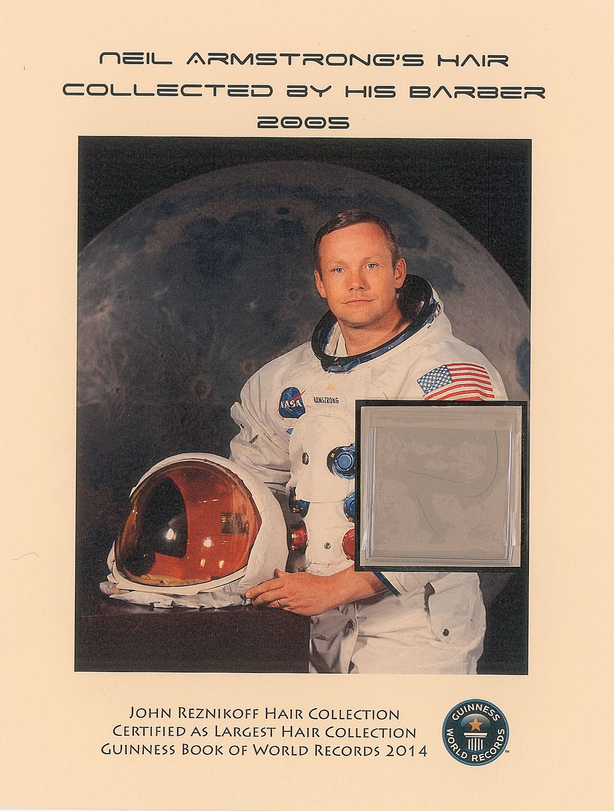 Five strands of Neil Armstrong's hair collected by his barber Max Sizemore, encapsulated and presented on an 8.5 x 11 sheet featuring his famous white space suit portrait. In fine condition. Accompanied by a certificate of authenticity from University Archives, whose president, John Reznikoff, was recognized by the Guinness Book of World Records in 2014 for having the world's largest hair collection. A unique relic of the first man to set foot on the moon.