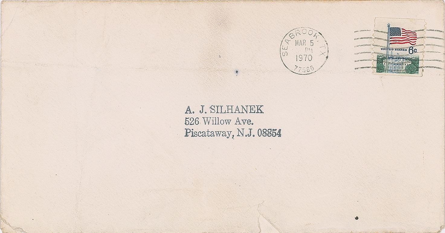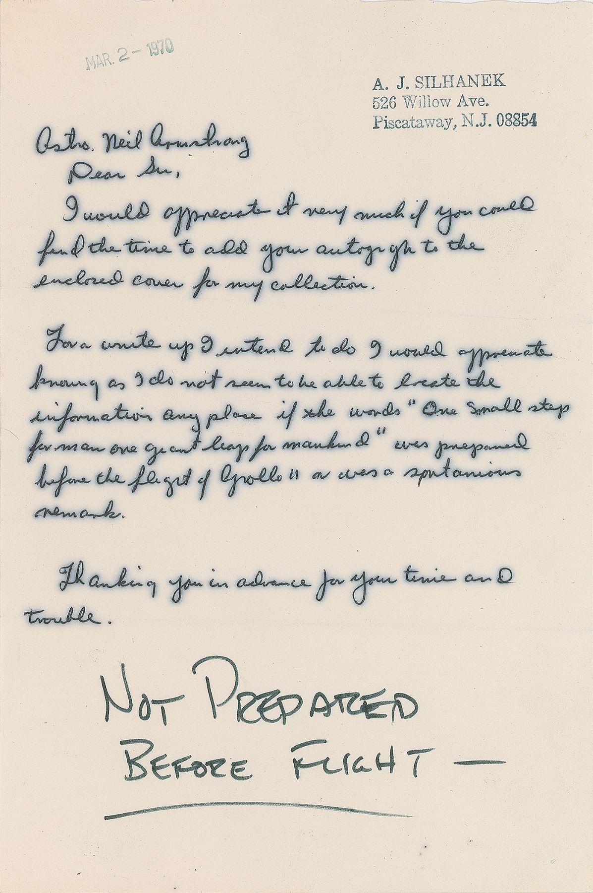 Important handwritten note by Armstrong at the conclusion of a letter sent to him, unsigned, one page, 6 x 9, stamp-dated March 2, 1970. Written by A. J. Silhanek of Piscataway, New Jersey, the original letter makes an inquisitive statement: "I do not seem to be able to locate the information any place if the words 'One small step for man one giant leap for mankind' was prepared before the flight of Apollo 11 or was a spontaneous remark." Armstrong replies below in large black felt tip: "Not Prepared Before Flight." In fine condition. Accompanied by the original mailing envelope. An interesting historical note on the 'spontaneous' origin of one of the most memorable quotes of the 20th century, which has been the subject of much study and discussion in the decades since.