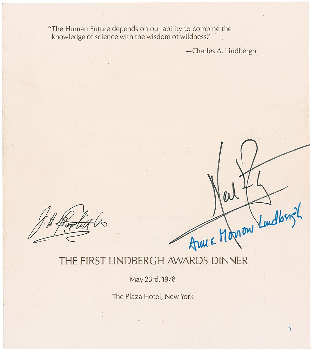 Program from the First Lindbergh Awards Dinner, held on May 23, 1978, at the Plaza Hotel in New York, 8 x 9, signed on the front cover in black felt tip, “Neil Armstrong,” and “J. H. Doolittle,” and in blue felt tip, “Anne Morrow Lindbergh.” In fine condition.
