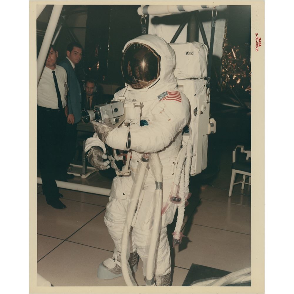 Original vintage color glossy 8 x 10 red-numbered NASA photo (S-69-38506) of Commander Neil Armstrong donning his white space suit with dropped visor and Hasselblad camera during Apollo 11 training activities. Reverse of photo bears "A Kodak Paper" watermarks. In very fine condition, with one tiny spot of emulsion irregularity.