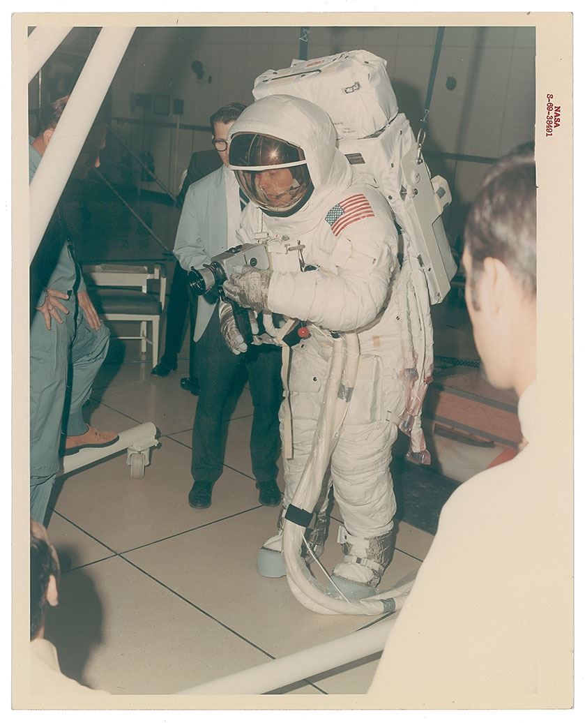One of the most incredible aspects of the Dan Schaiewitz Collection is the astounding assortment of vintage NASA photographs. As an integral part of KSC’s PLSS training, most notably on the first lunar landing mission, he actually took part in these amazing behind-the-scenes moments: Dan himself tested Armstrong’s space suit. Offered here are exceptionally rare Apollo 11 red-numbered training photographs, many of them quite possibly never-before-seen by collectors and offered here for the first time.