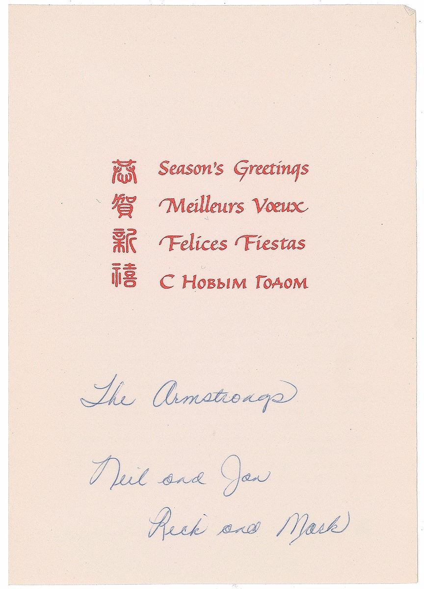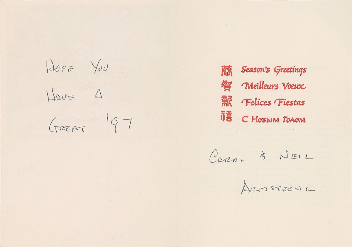 Three Christmas cards, including: a 1996 UNICEF season’s greetings card, signed, “Carol & Neil Armstrong,” adding “Hope you have a great ’97,” on the adjacent side; a 1999 card featuring a snowy scene, signed, “Carol & Neil Armstrong”; and an undated holiday card depicting a barn, signed “Neil Armstrong.” In overall fine condition. Two are accompanied by the original mailing envelopes addressed in Armstrong’s hand. Also accompanied by an assortment of unsigned cards and ephemera.