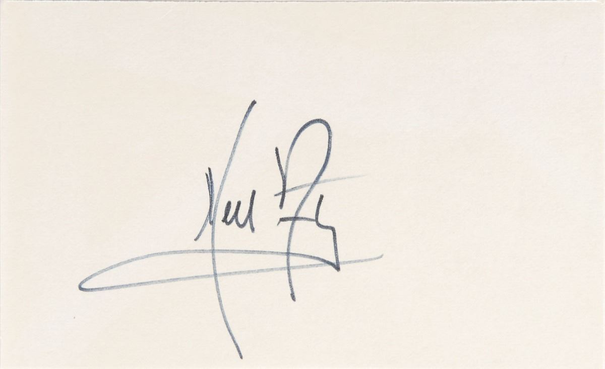 Bold felt tip signature, “Neil Armstrong,” on an off-white 5 x 3 card. In fine condition, with faint irregular toning. The consignor notes that he initially sent Armstrong a Christmas card in December 1989 with a request that he sign an enclosed FDC; the cover was returned unsigned along with a letter from Armstrong’s administrative aide Vivian White, stating that it was the astronaut’s policy not to sign philatelic items. The consignor then sent this plain index card in its place, which was promptly signed and returned in March 1990. Accompanied by both the unsigned FDC and White’s letter.