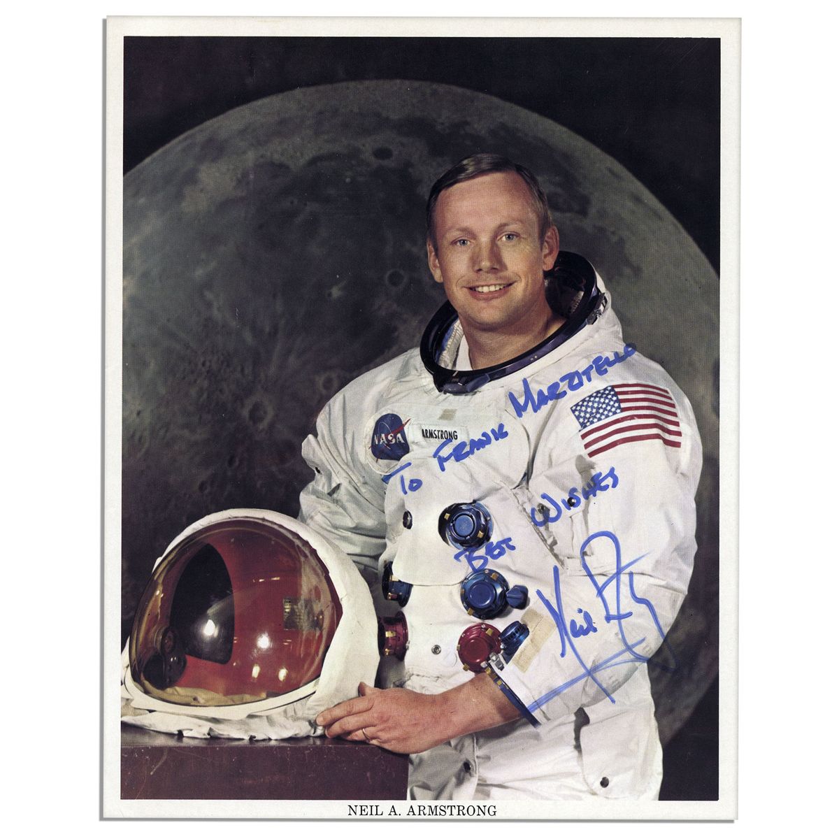 NASA publicity photo signed, ''Neil Armstrong'' across his spacesuit. Semi-matte photo also bears his autograph inscription, ''To Frank Marzitello / Best Wishes''. A small summary of Armstrong is printed to verso. Semi-matte photo measures 8'' x 10''. Near fine. With PSA/DNA COA.