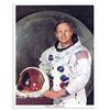 Neil Armstrong signed photo. The first man on the moon inscribes the lower right: ''To Erik Jon Hoffmann / Neil Armstrong'' in blue felt tip. NASA insignia and a short bio of Armstrong to verso. Semi-matte photo measures 8'' x 10''. Near fine.