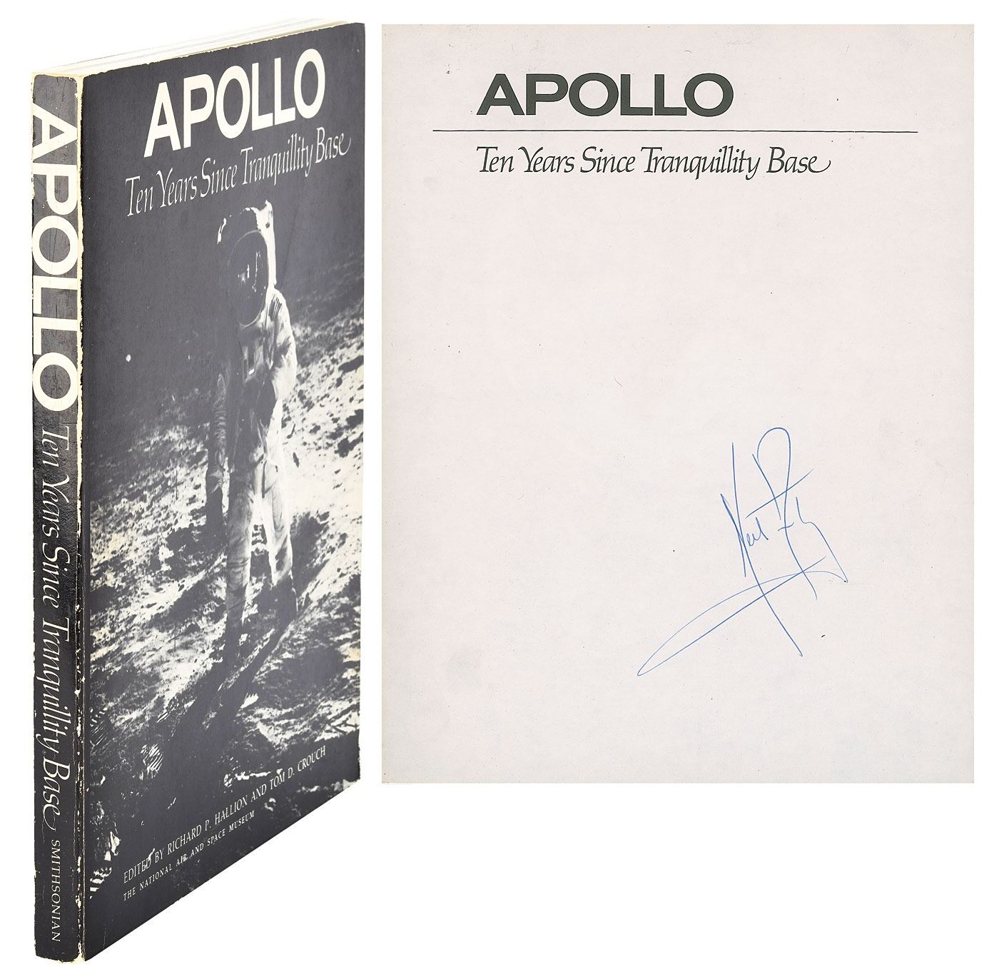 Sought-after signed book: Apollo: Ten Years Since Tranquility Base. Washington, D.C.: National Air and Space Museum, 1979. Softcover, 8 x 10, 174 pages. Signed nicely on the half-title page in blue ballpoint by Neil Armstrong. In fine condition, with light cover wear. Accompanied by a full letter of authenticity from Zarelli Space Authentication.