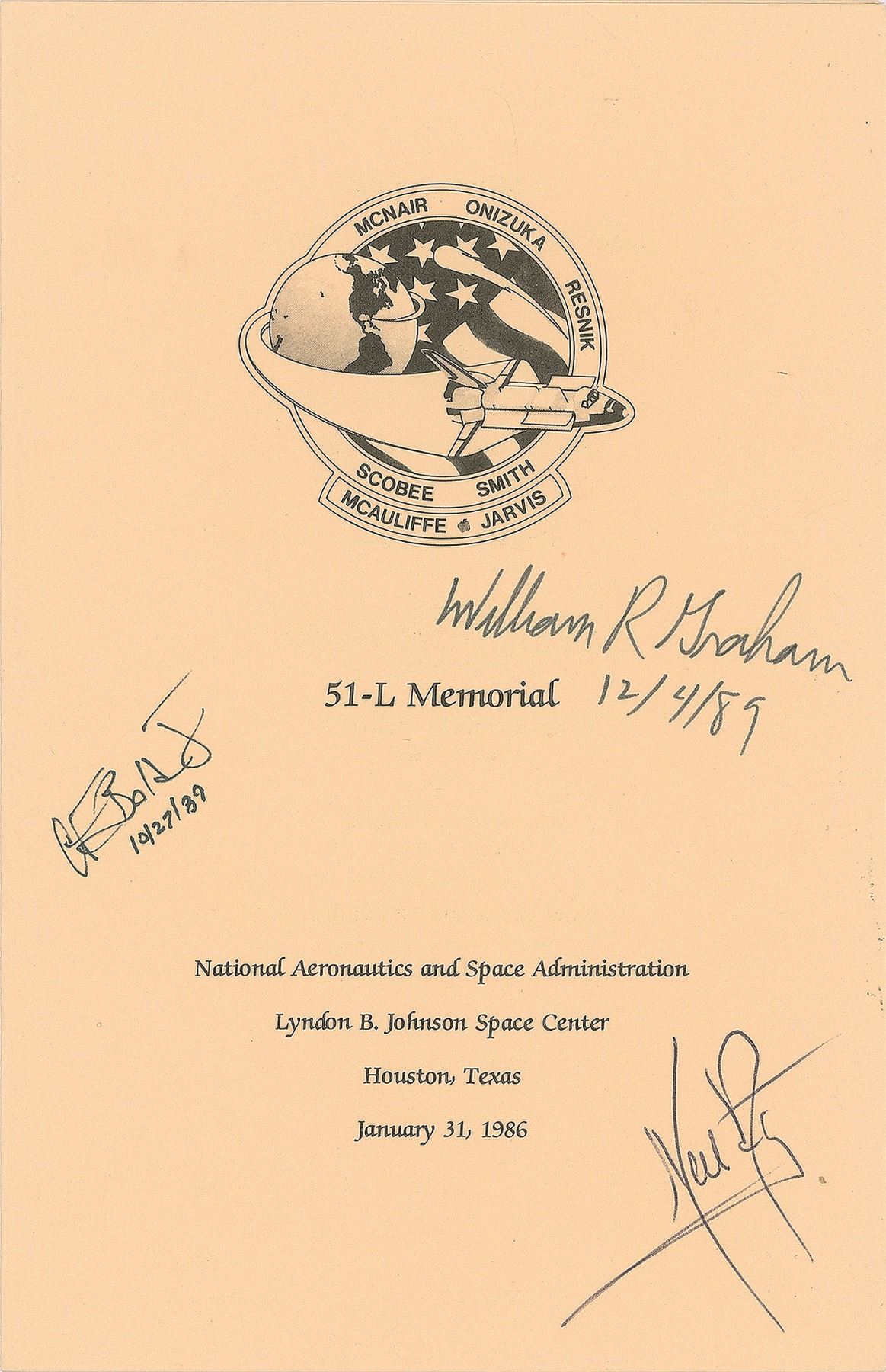 Program for an STS-51-L memorial held at the Johnson Space Center on January 31, 1986, two pages, 5.5 x 8.5, signed on the front cover in black ballpoint by Neil Armstrong, and in black felt tip by NASA administrators Charles Bolden and William R. Graham, both of whom add later dates. In very fine condition. Armstrong served as Vice Chairman of the Rogers Commission Report, the presidential commission charged with investigating the STS-51-L Space Shuttle Challenger disaster. A unique piece connecting one of NASA's foremost triumphs—landing a man on the moon and returning him safely—to one of its greatest tragedies.