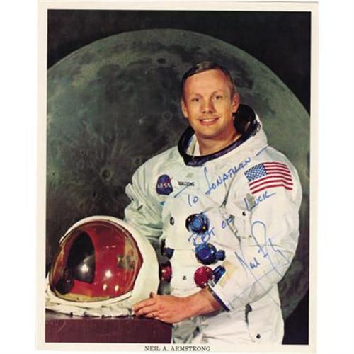 <B>Neil Armstrong Signed Color Photograph</B></I> , 8" x 10". Signed "<I>To Jonathan-/ Best of Luck/ Neil Armstrong</B></I>". Armstrong is pictured here in his Apollo 11 spacesuit.<BR><BR><b>Shipping:</b> Flat Material, Small (<a target="_blank" href="http://www.heritageauctions.com/common/shipping.php">view shipping information</a>)