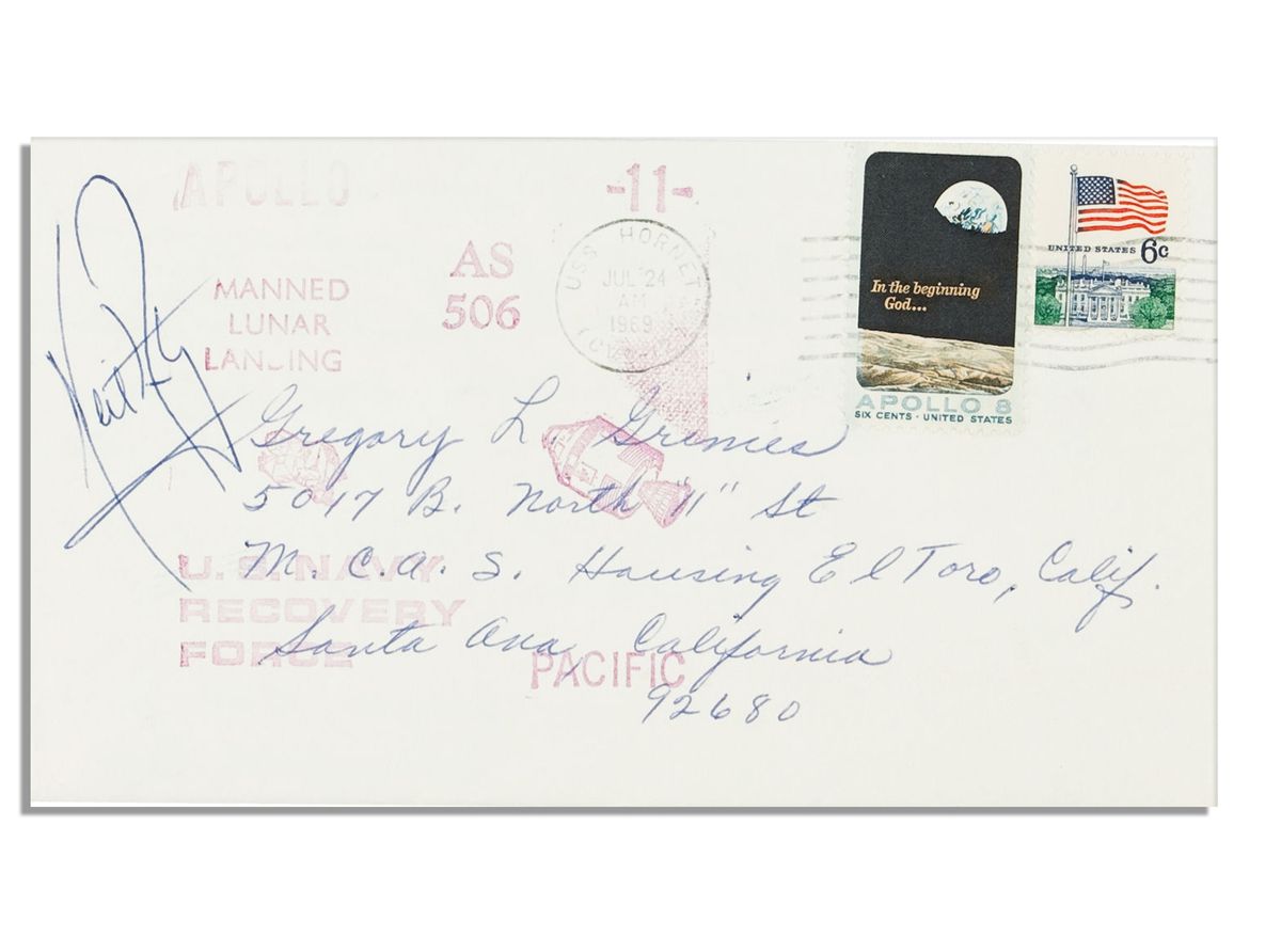 Neil Armstrong signed cover. The first man to walk on the moon signs ''Neil Armstrong'' to a commemorative cover from the splashdown recovery. The U.S.S. Hornet welcomed the astronauts back from space when Columbia dropped into the Pacific following the successful mission. Cover is rubber stamped ''Apollo 11 / AS 506 U.S. Navy Recovery Force'' and was cancelled aboard the U.S.S. Hornet on 24 July 1969. Addressed in ink by an unknown hand. Measures 6.5'' x 3.75''. Near fine.