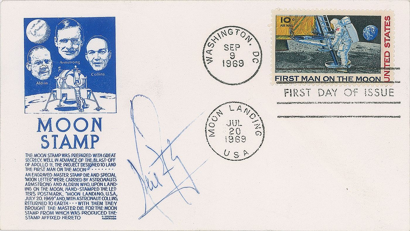 Highly desirable FDC with a cachet honoring the 'Moon Stamp' released in 1969, signed in blue ballpoint by Neil Armstrong. In fine condition.