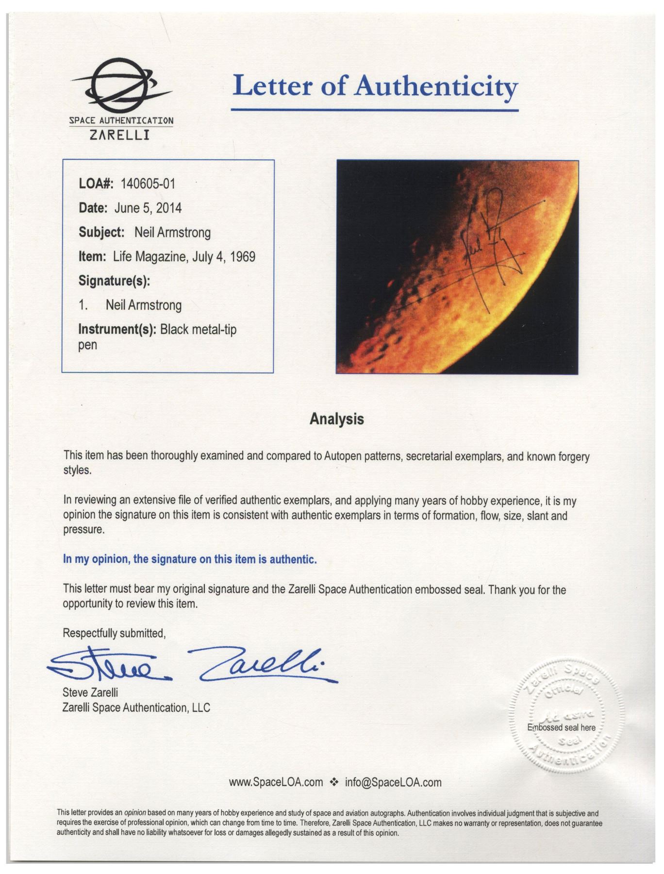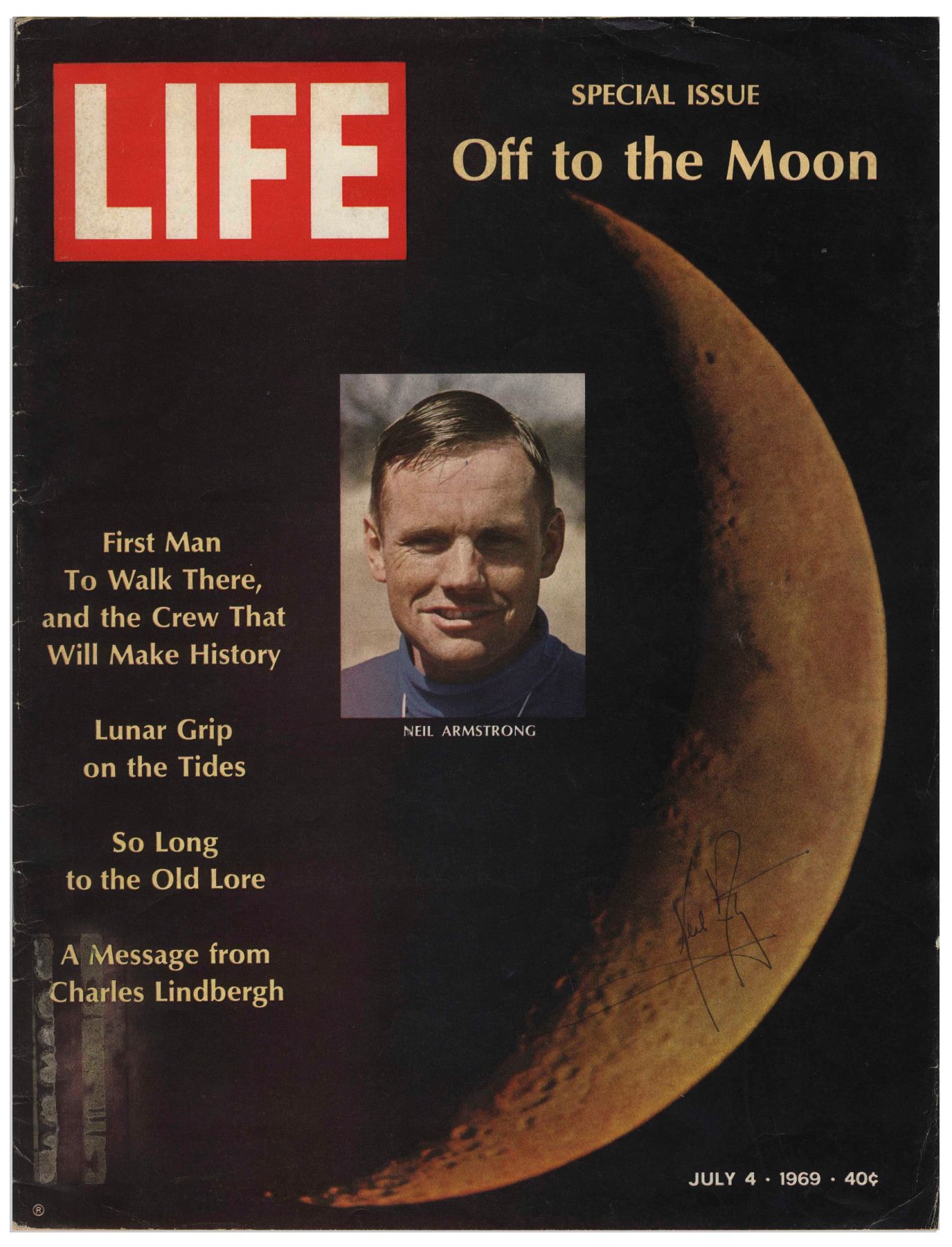 Neil Armstrong signed ''Life'' Magazine with Armstrong boldly signing his name on the light side of the moon, underneath his photo. Special issue of the magazine is dated 4 July 1969, titled ''Off to the Moon''. Magazine measures 10.5'' x 13.5''. Light wear and creasing, otherwise near fine. With Steve Zarelli Space Authentication COA.