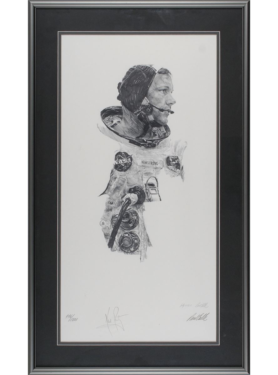 Extraordinary limited edition 12 x 23.75 lithograph of Armstrong in his flight suit prior to the Apollo 11 mission, numbered 996/1000, signed in pencil. Also signed in pencil by the artist, Paul Calle, beneath his pre-printed signature. Handsomely double-matted and framed to an overall size of 17.25 x 29. In fine condition. This highly desirable item is the only individual print edition that Armstrong signed. Oversized.