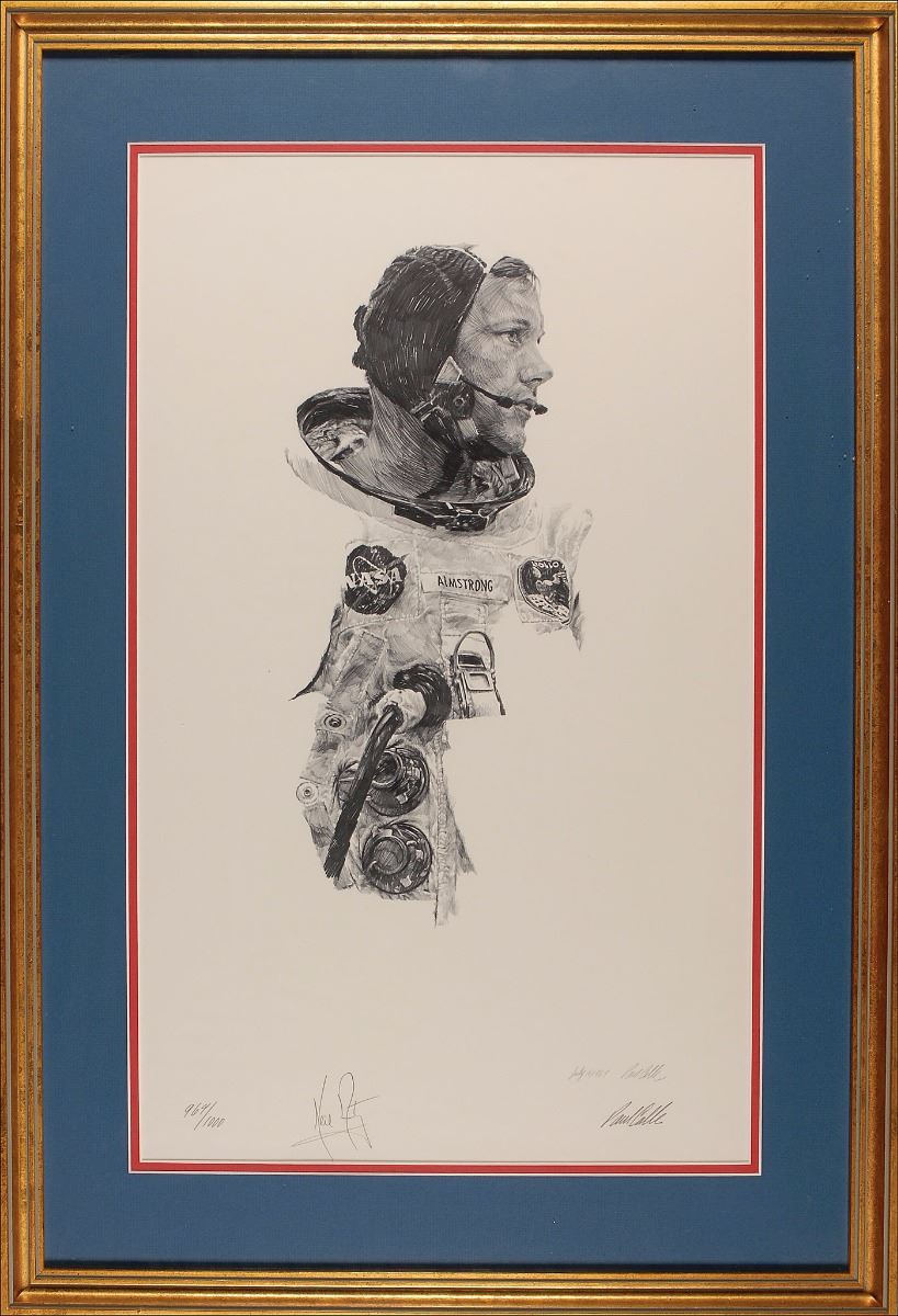 Limited edition 14 x 22.75 lithograph of Armstrong in his flight suit prior to the Apollo 11 mission, numbered 964/1000, signed in pencil by Armstrong. Also signed in pencil by the artist, Paul Calle, beneath his pre-printed signature. Attractively double-matted and framed to an overall size of 20.5 x 29.5. Affixed to the reverse of the frame is the uncommon 17.25 x 10 printed description picturing a photograph captioned “Paul Calle and Neil Armstrong sign the prints at the National Air and Space Museum on December 23, 1976.” In fine condition. This highly desirable, virtually pristine item is the only individual print edition that Armstrong signed. Oversized.
