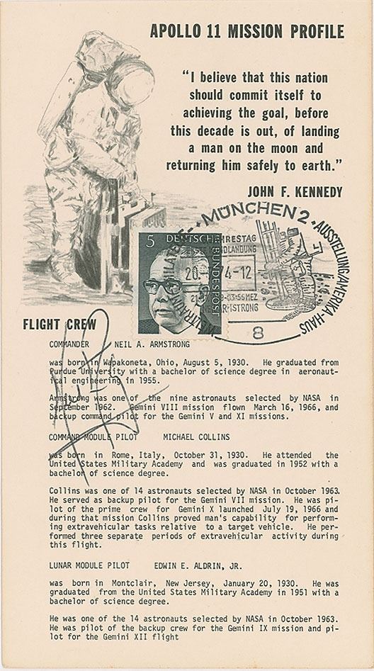 Uncommon Apollo 11 mission profile card, 3.5 x 6.25, signed in black ballpoint by Neil Armstrong. The card bears a German postmark of July 20, 1974, with affixed stamp, and the card features information text relative to the mission, as well as a quote from President John F. Kennedy. In fine condition.