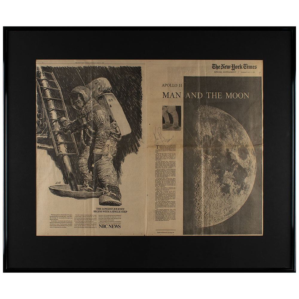 Extremely desirable ‰Û÷Special Supplement‰Ûª to The New York Times newspaper from July 17, 1969, with header, ‰ÛÏApollo 11: Man and the Moon,‰Û measures 28.5 x 22.75 open to show front and back pages, signed on the front page in black ballpoint, ‰ÛÏNeil Armstrong, Apollo 11.‰Û The back page features a large image of a Paul Calle drawing, which depicts an Apollo astronaut preparing to set foot on the lunar surface. Matted and framed to an overall size of 36.75 x 30.75. In fine condition, with two vertical folds, and light toning along the single horizontal fold.