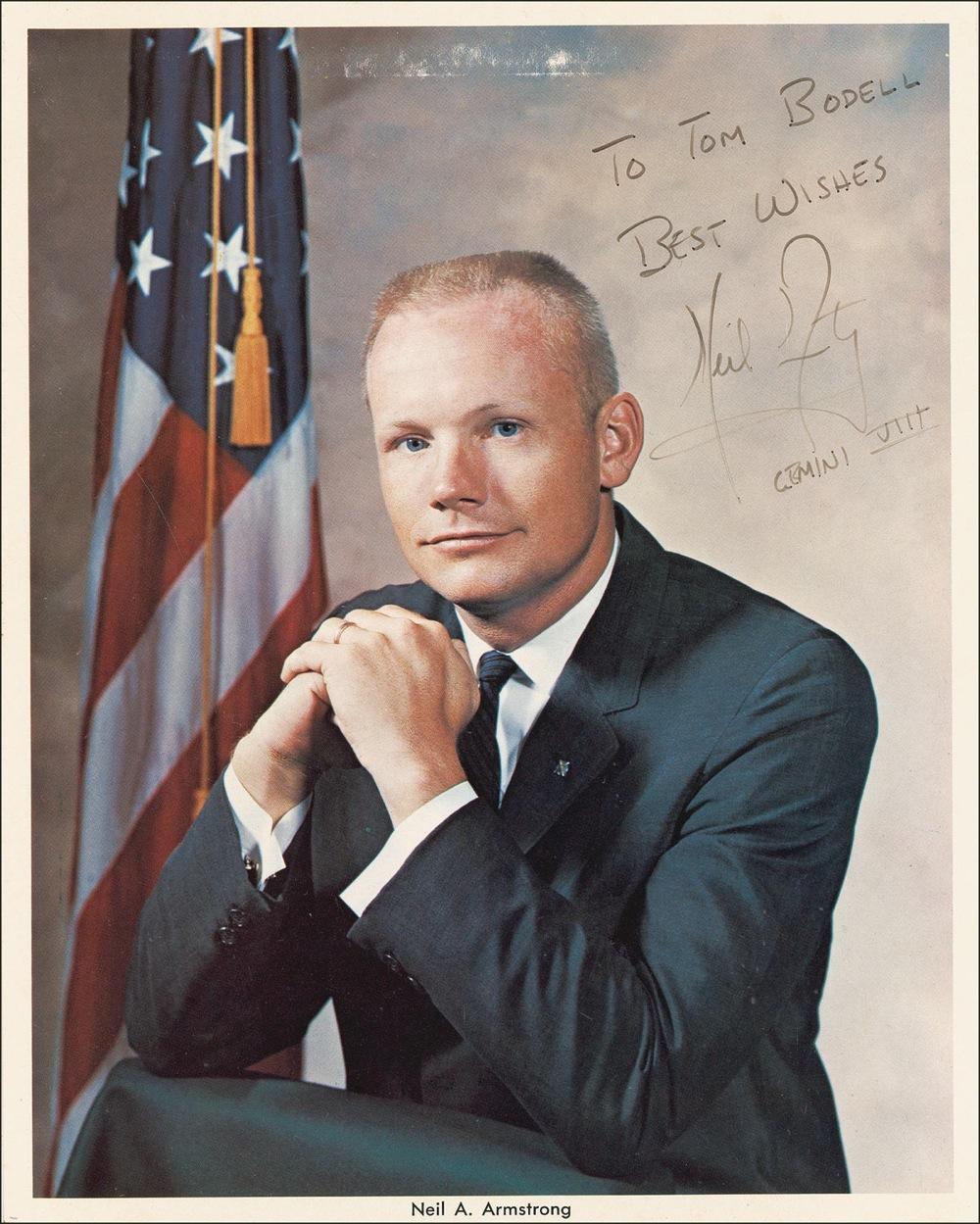 Vintage, color NASA photo of Neil Armstrong, signed by the famous astronaut in black felt tip pen. Dated 16 March 1966, inscription reads: “To Tom Bodell, Best wishes, Neil Armstrong, Gemini VIII.” Measures 8'' x 10''. Light surface rubbing to top edge of background, otherwise very good condition.