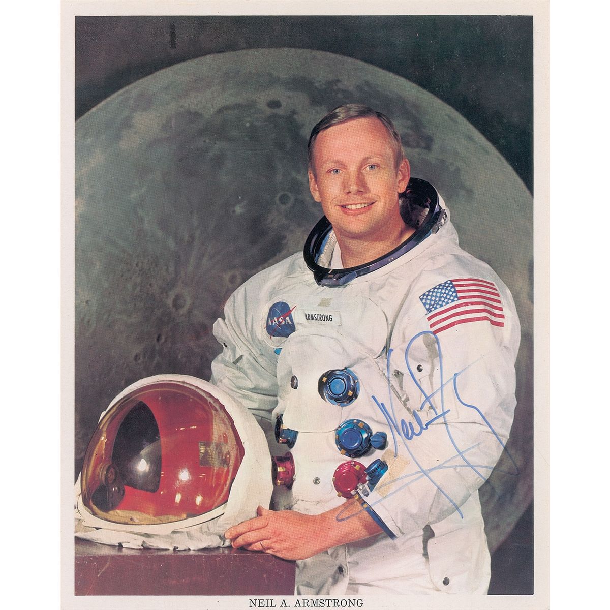 Highly desirable uninscribed official color 8 x 10 NASA lithograph of Armstrong in his white space suit, signed in blue felt tip by Armstrong. In fine condition, with a small paperclip impression to top edge and a couple trivial bends, one of which unobtrusively passes through Armstrong’s facial area. Uninscribed photos of Armstrong represent one of the most coveted prizes in the entire field of space collecting.