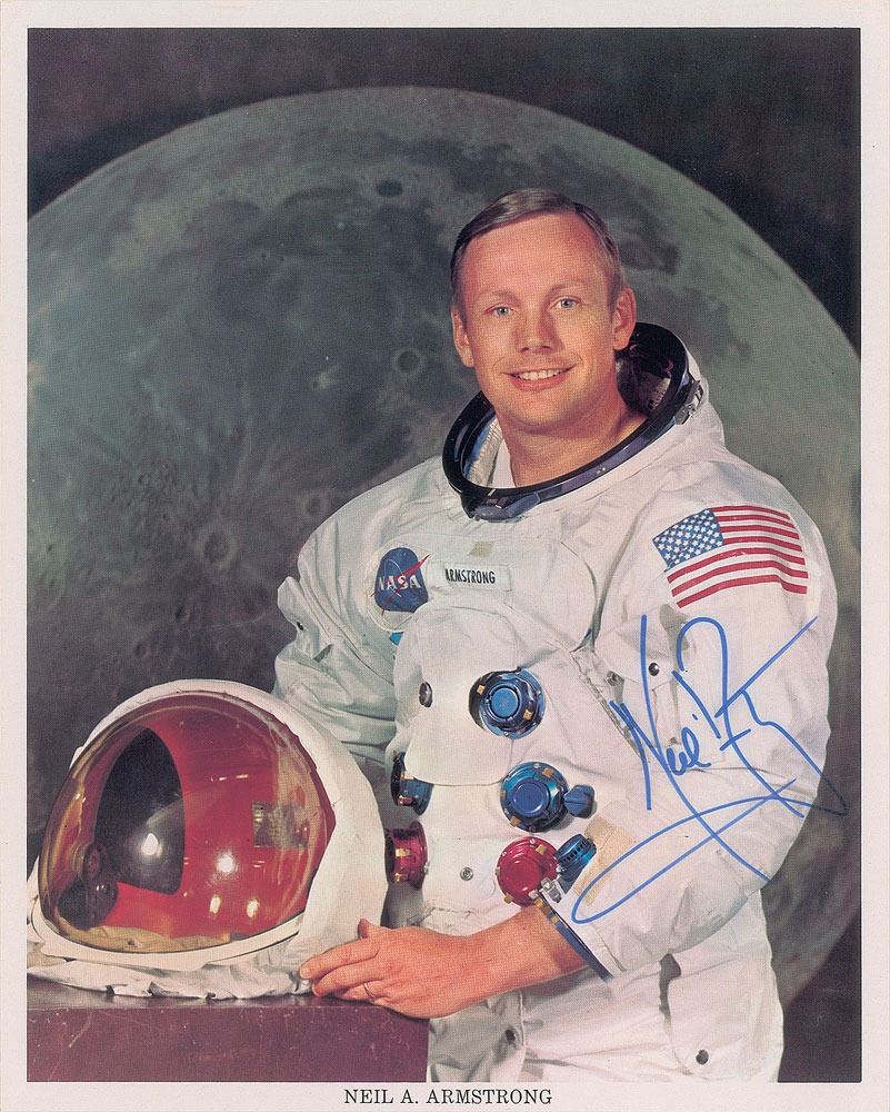 Exemplary uninscribed official color 8 x 10 NASA lithograph of Armstrong in his white space suit, boldly signed in blue felt tip. In fine condition.