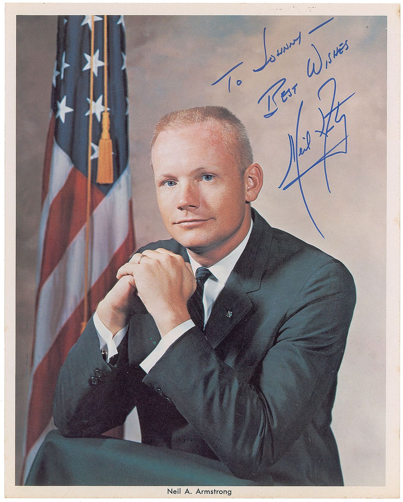 Superb official color 8 x 10 NASA lithograph of the Apollo 11 commander in a formal half-length pose, signed and inscribed in blue felt tip, "To Johnny—Best wishes, Neil Armstrong.” In fine condition. A neatly signed and seldom-offered portrait of the first man on the moon.