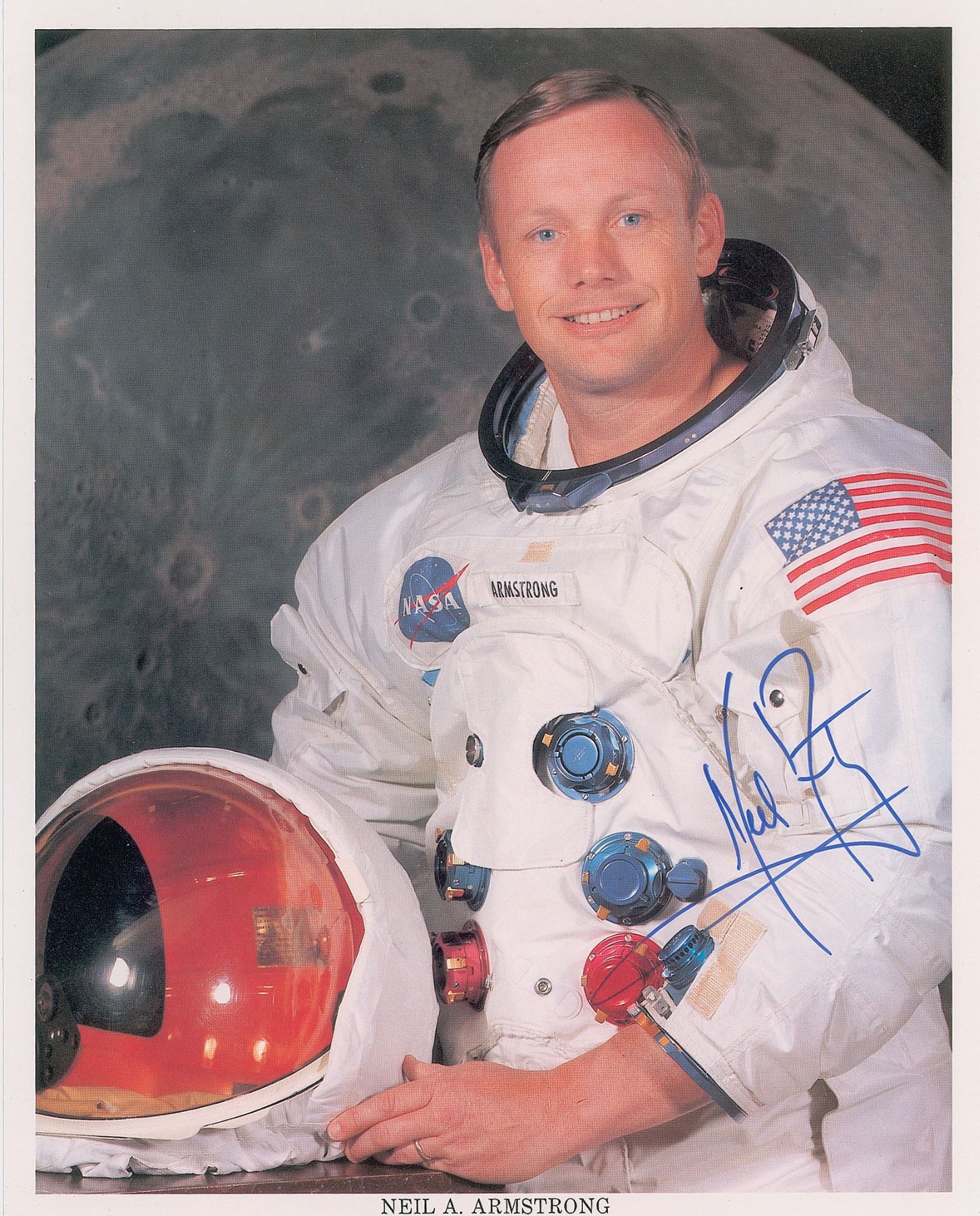 Beautiful official color 8 x 10 NASA lithograph of Commander Neil Armstrong posing in his white space suit against a lunar backdrop, signed in blue felt tip. In very fine condition. A highly sought-after and uninscribed example.